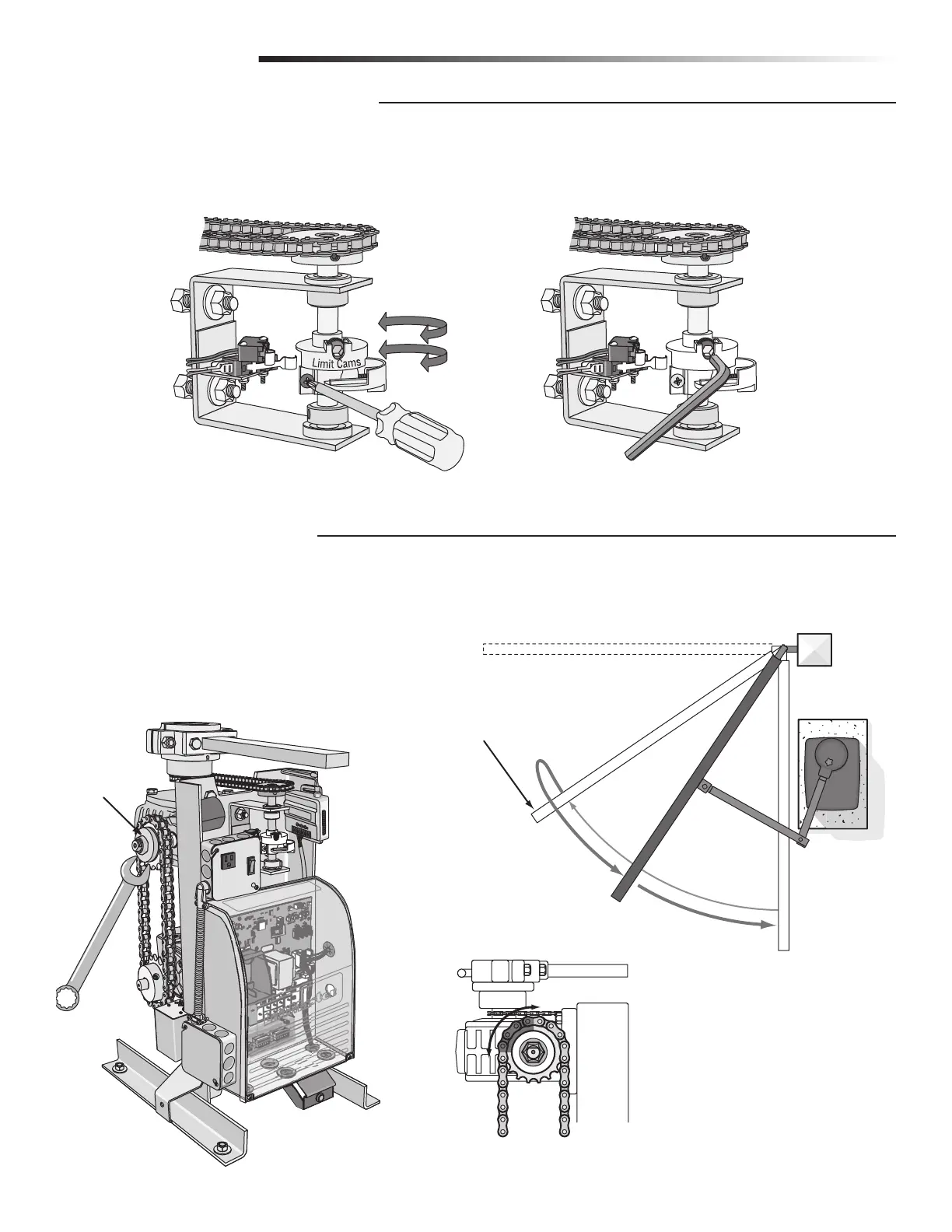 Release the red handle and move the gate to the open position. Loosen the screw on one of the limit cams and turn the cam until the