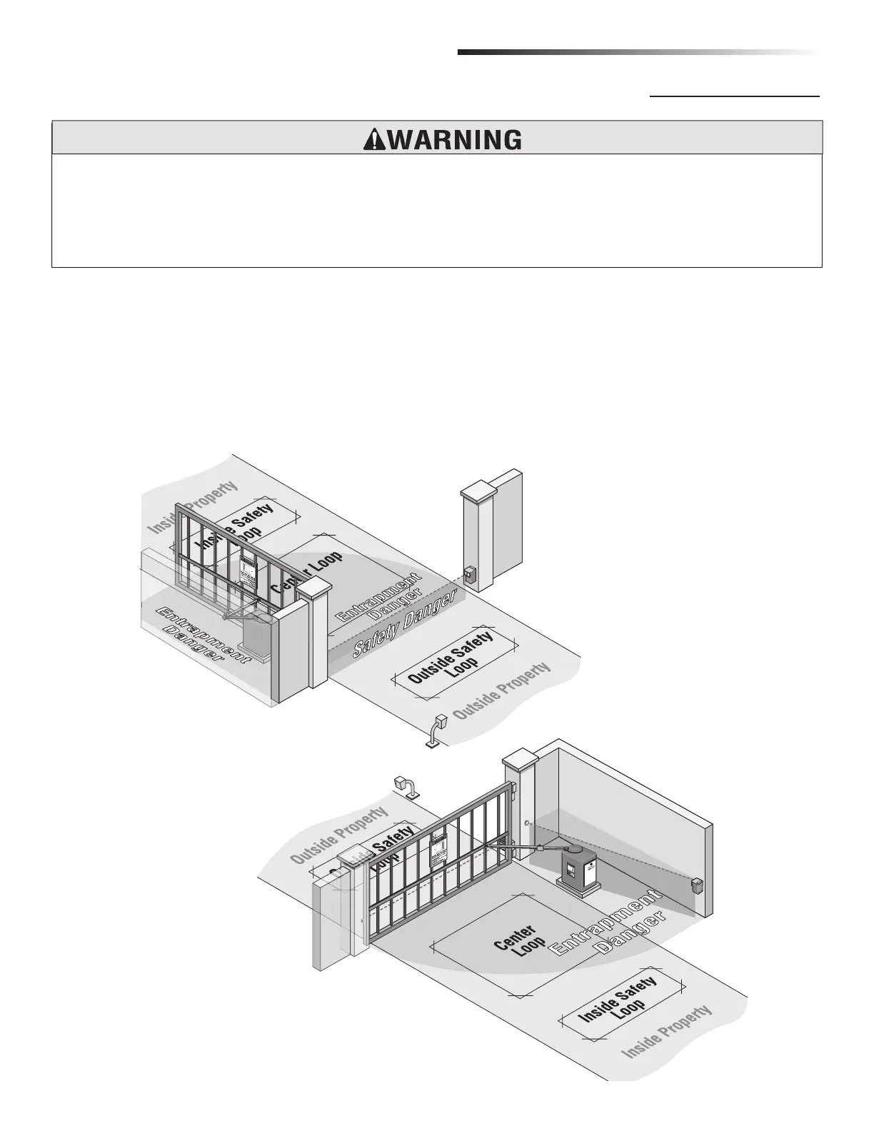 • Entrapment protection devices MUST be installed to protect anyone who may come near a moving gate.