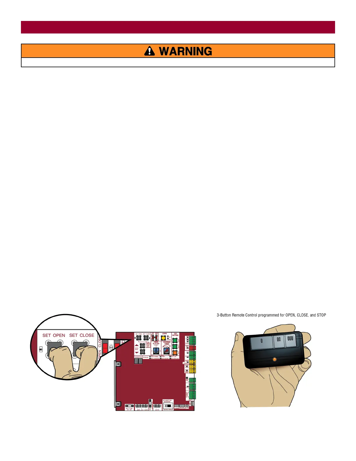 To set the limits using a remote control, first you will need a 3-button remote control that has been programmed for OPEN, CLOSE, and STOP. Refer to the