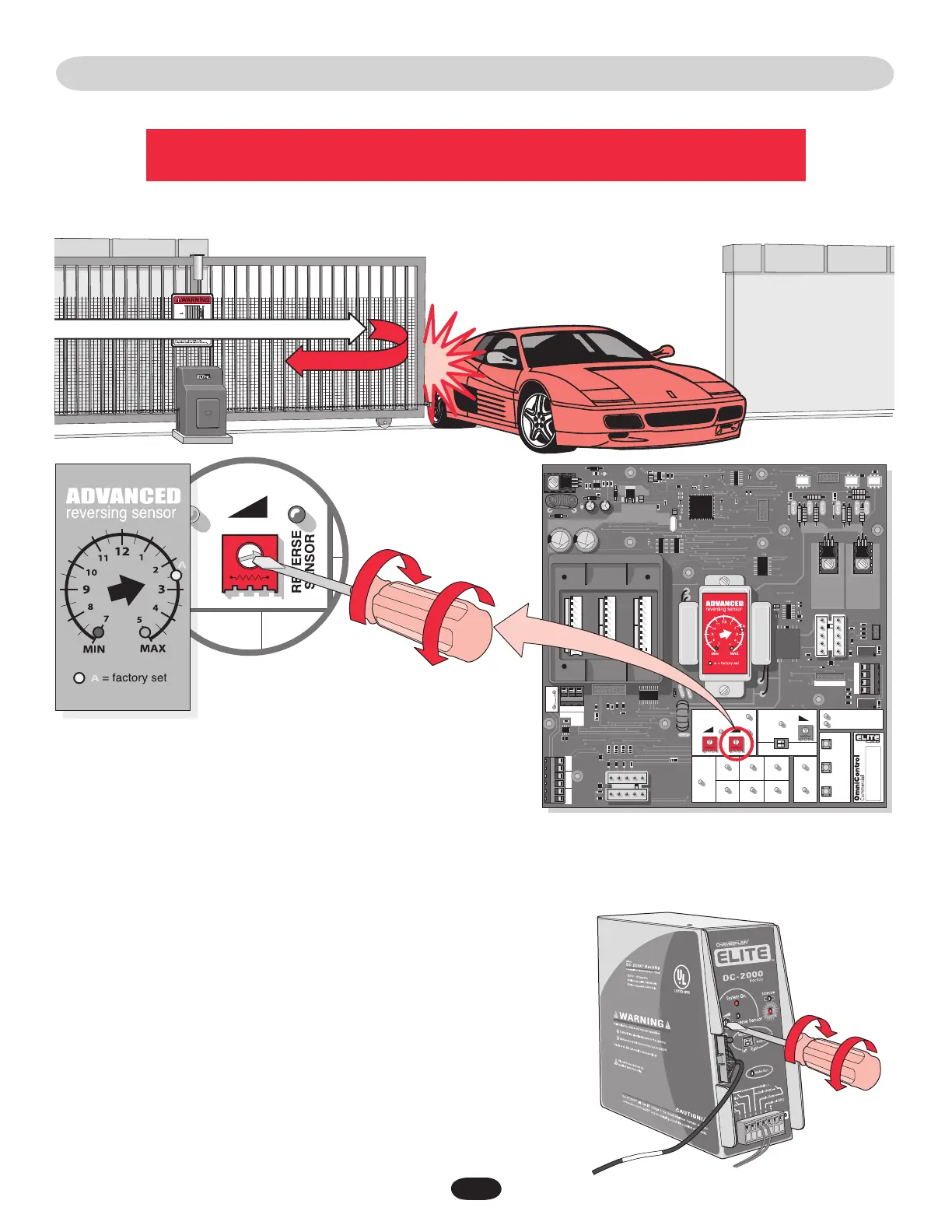 Adjust the “Reverse Sensor” on the control board. Alarm Sensor does not need to be adjusted except where noted below.