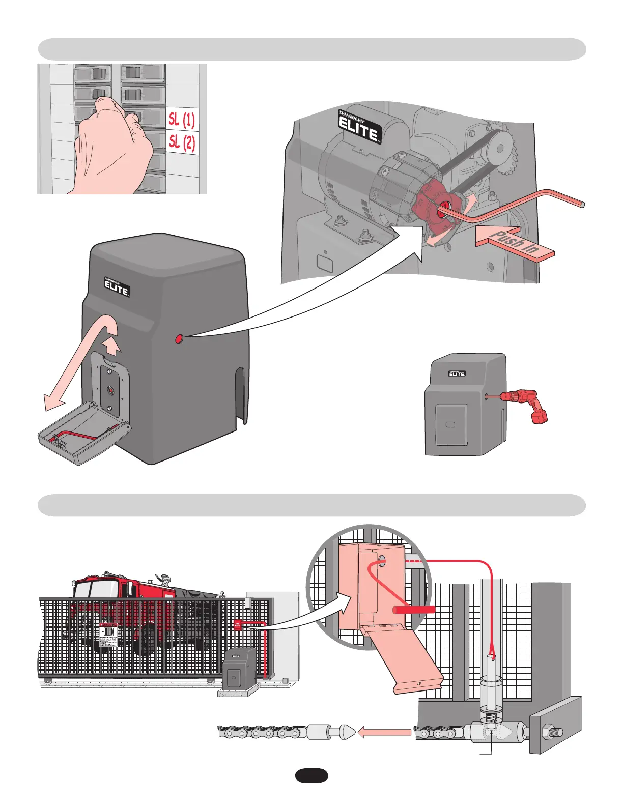 Push the crank tool in hole. Safety releases will