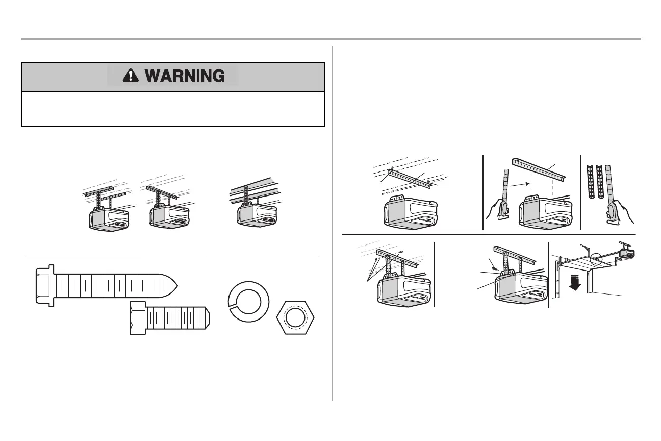 5. Attach the garage door opener to the hanging brackets with the hex bolts, lockwashers,and