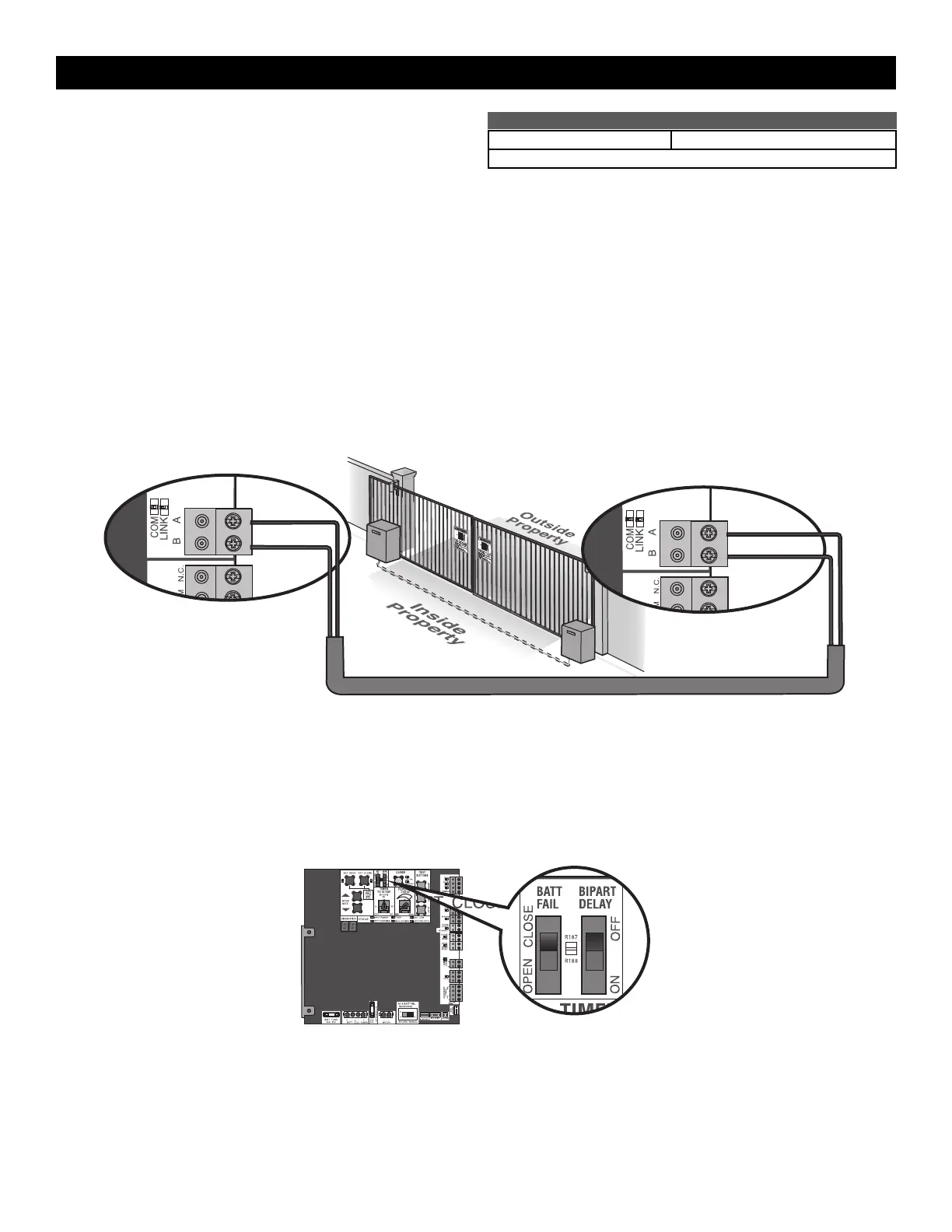 To synchronize the closing of the gates, set the BIPART DELAY switch to ON for both operators.