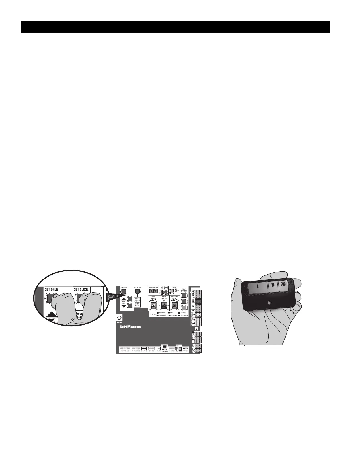 To set the limits using a remote control, first you will need a 3-button remote control that has been programmed for OPEN, CLOSE, and STOP. Refer to