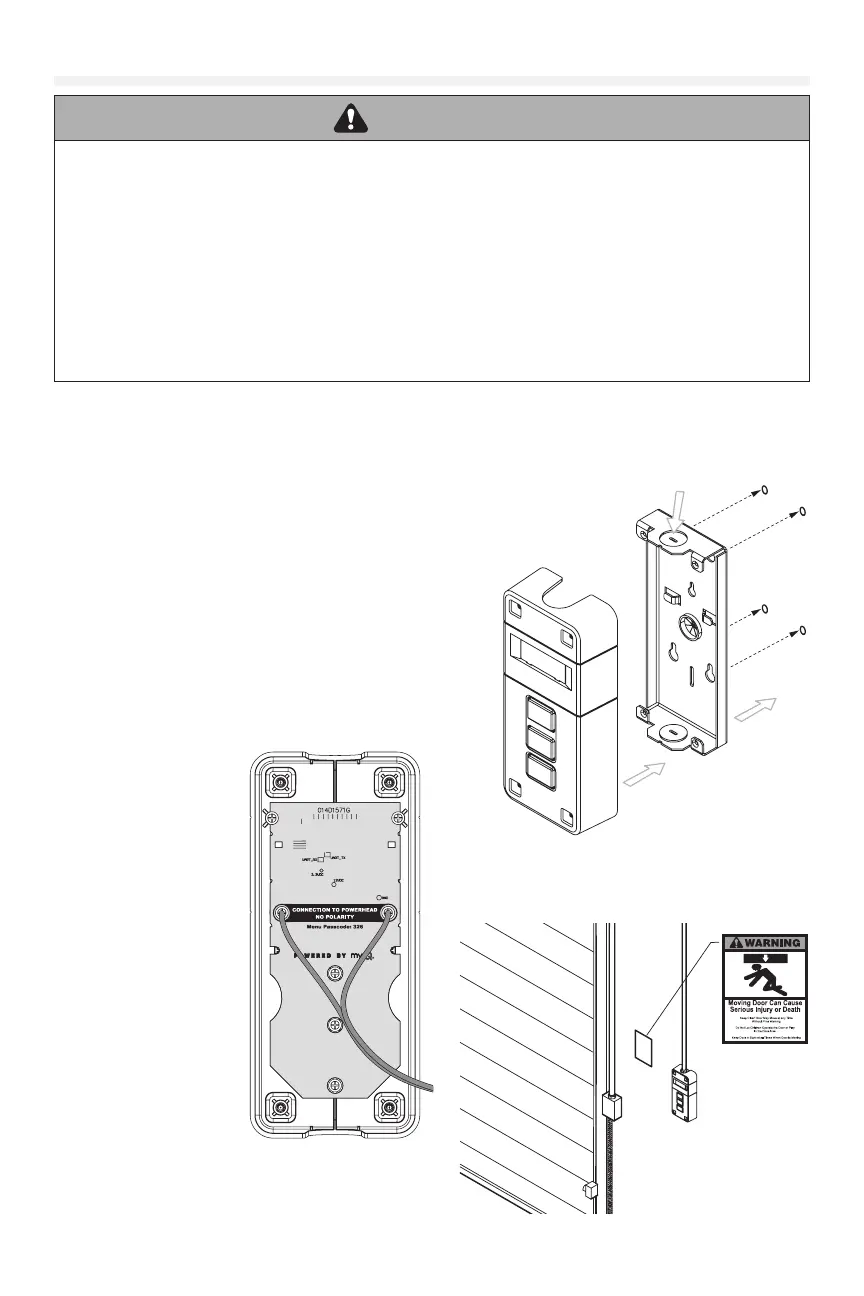 • Install the entrapment warning placard on the wall next to the control station in a prominent location visible from