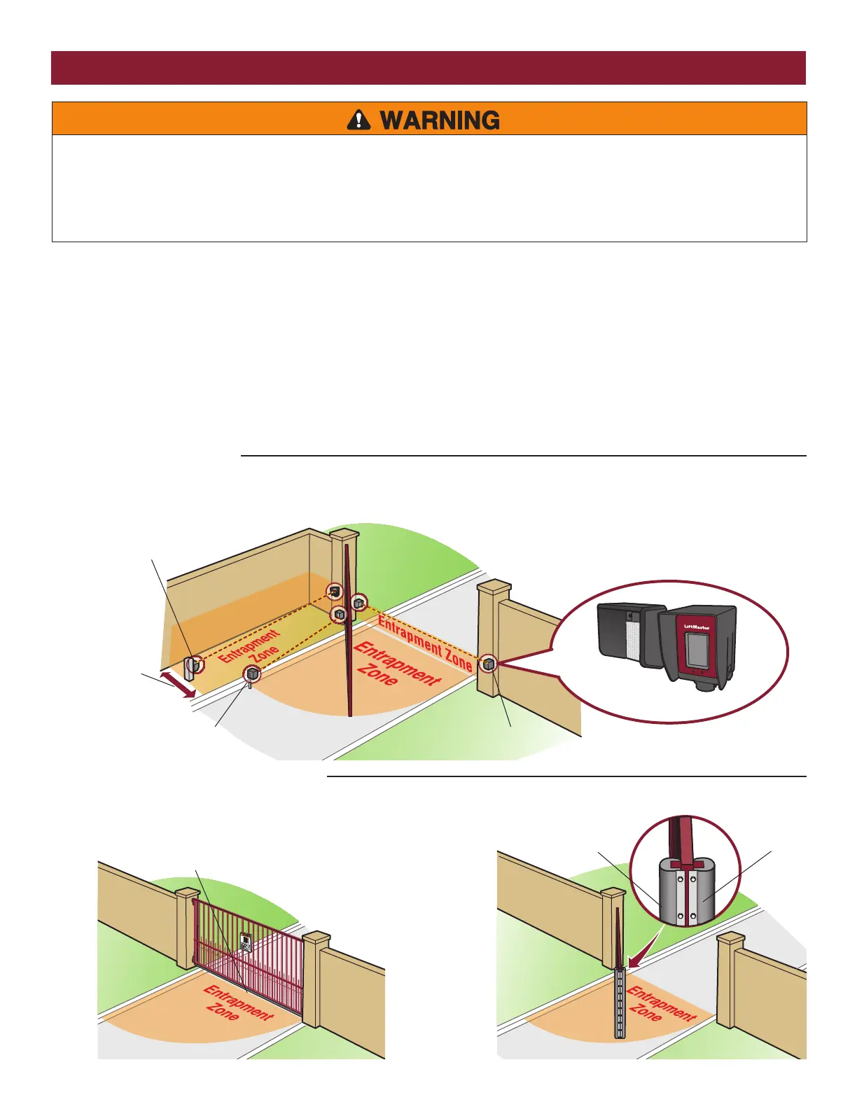 application may contain one or many entrapment zones. Property owners are obligated to test entrapment protection devices monthly. Use only