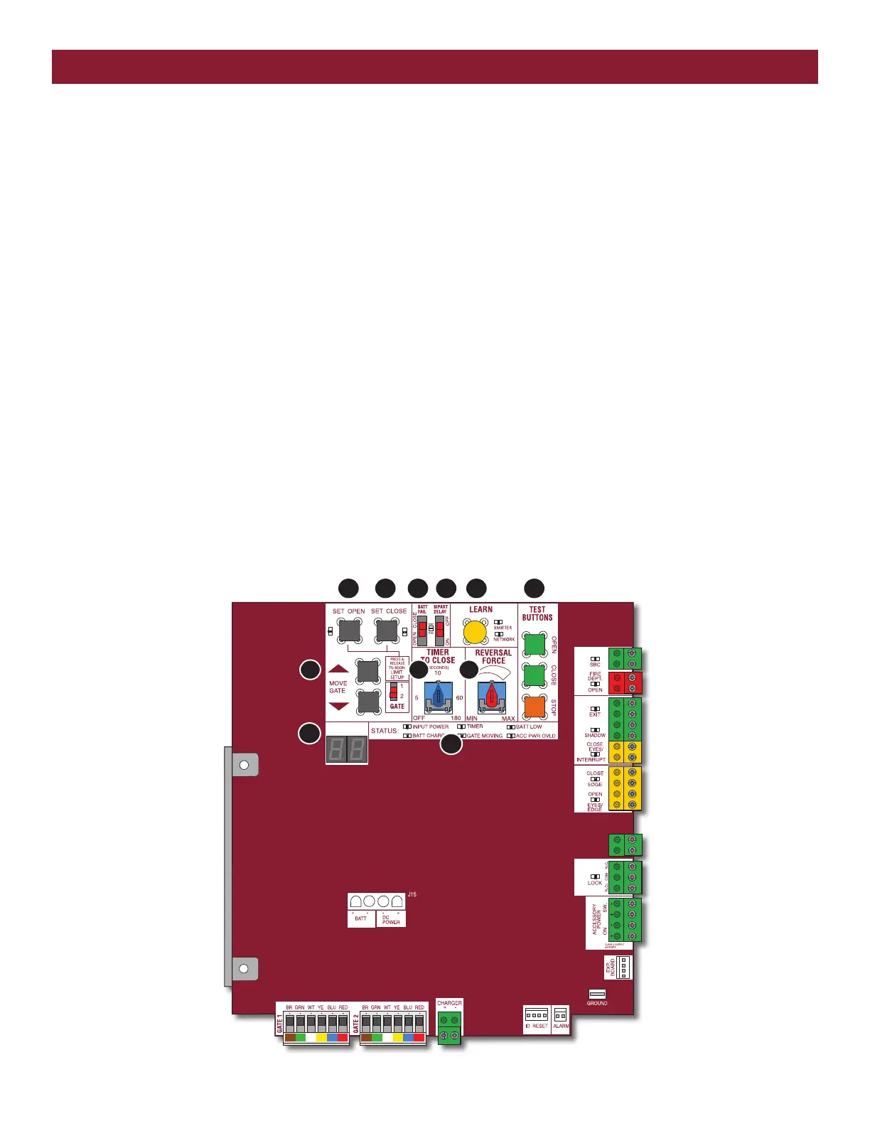 9 TEST BUTTONS: The TEST BUTTONS will operate the gate (OPEN, STOP and CLOSE).