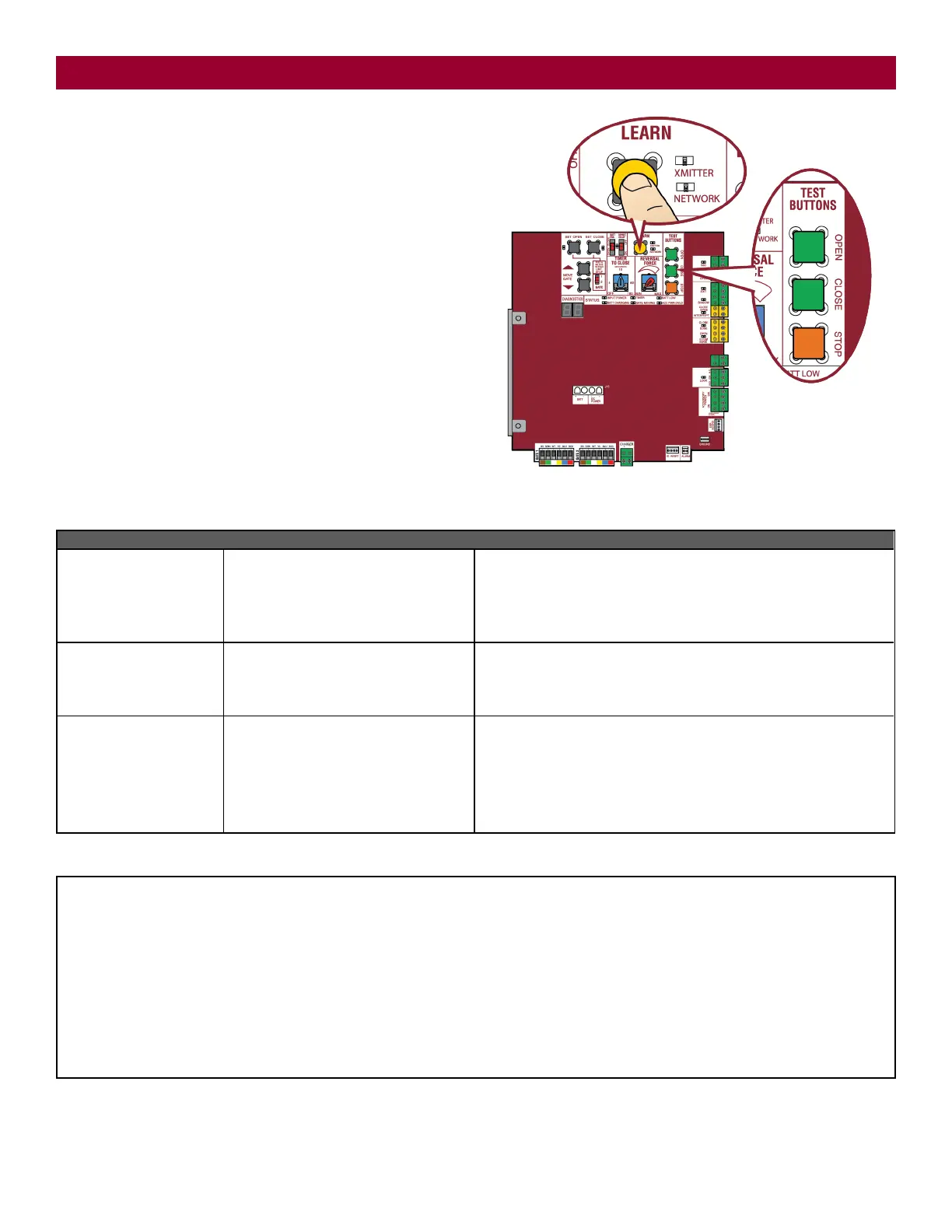 The operator will automatically exit learn mode (operator will beep and green XMITTER LED will go out) if programming is successful. To program