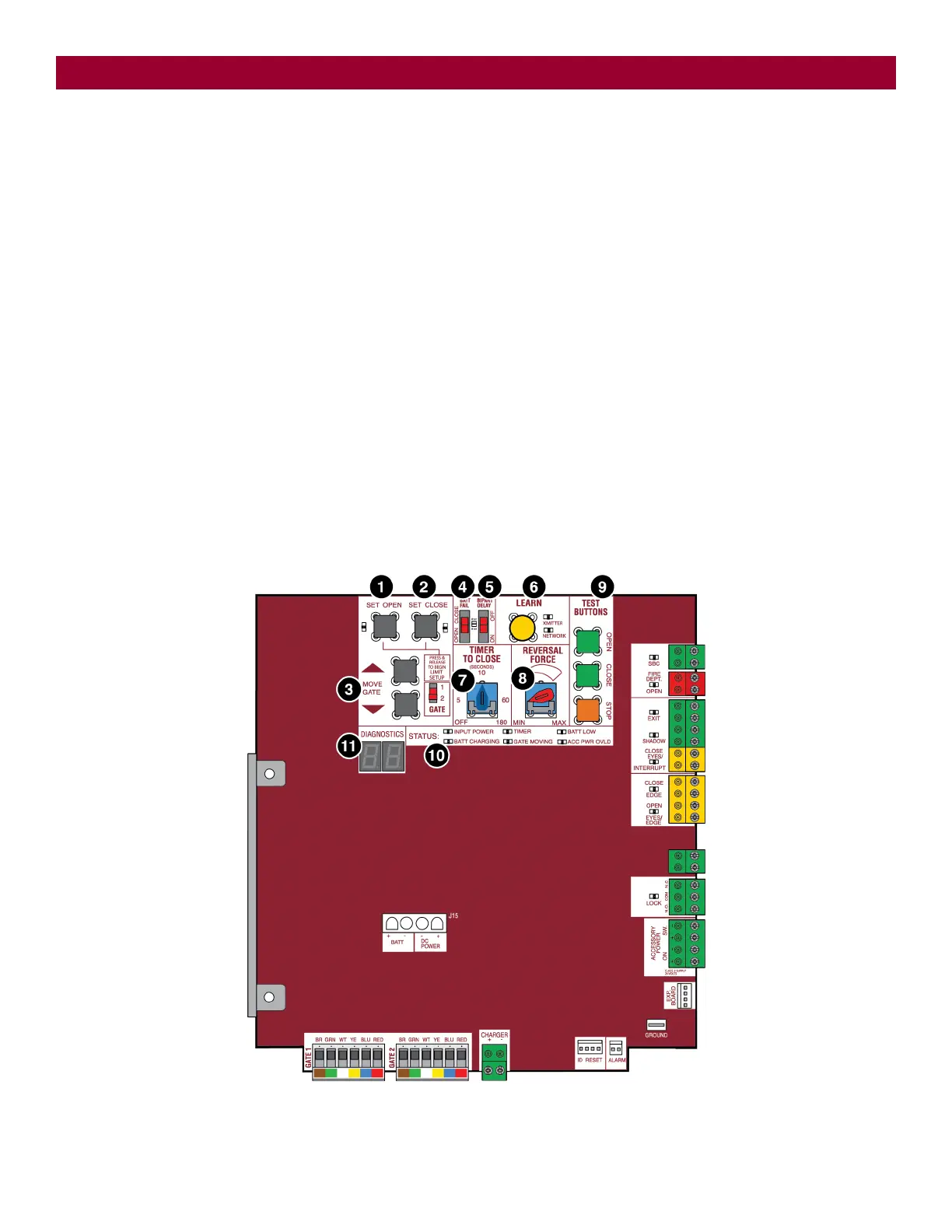 9 TEST BUTTONS: The TEST BUTTONS will operate the gate (OPEN, STOP and CLOSE).