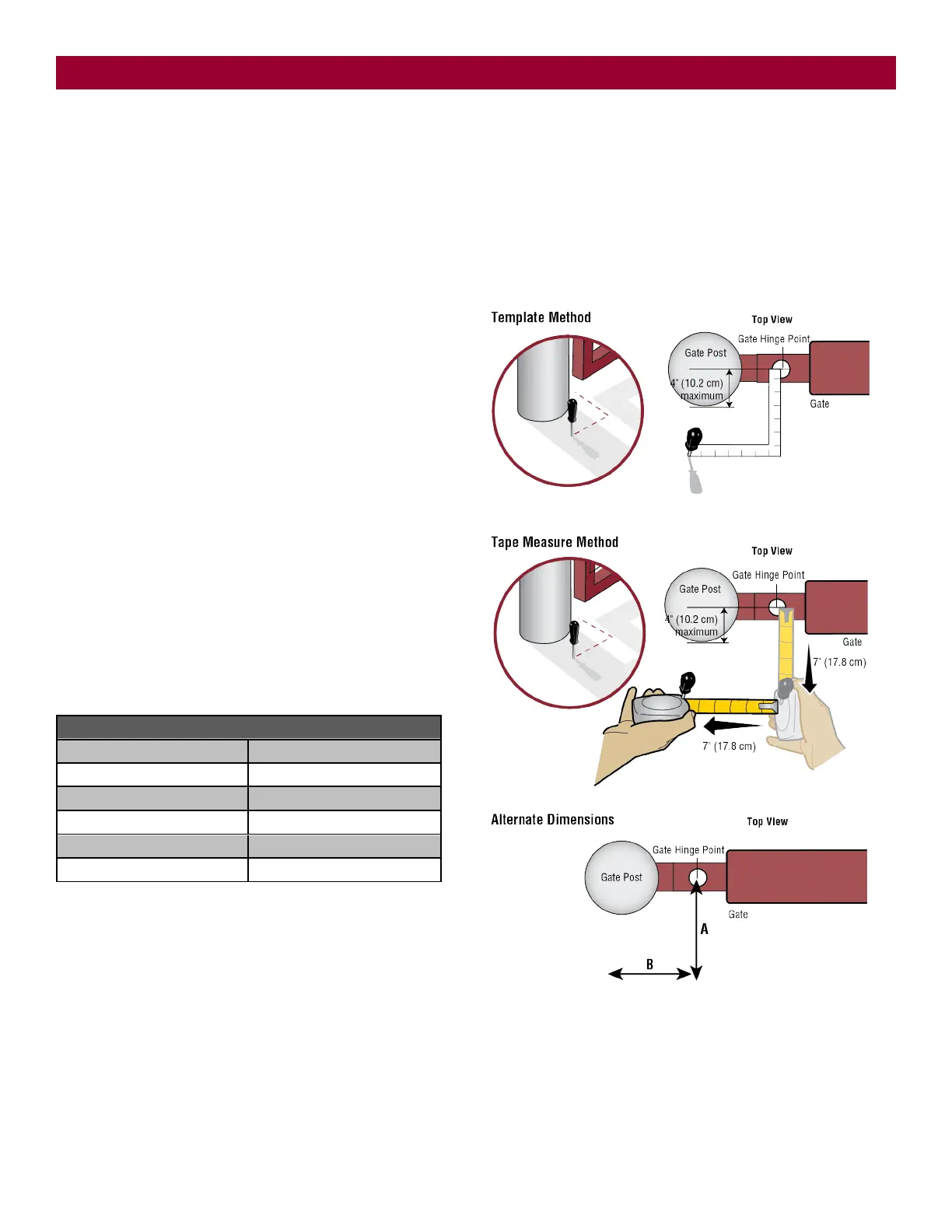 NOTE: There should only be a maximum of 4" (10.2 cm) from the center of the hinge to the edge of the post or column. If the distance is greater than 4"
