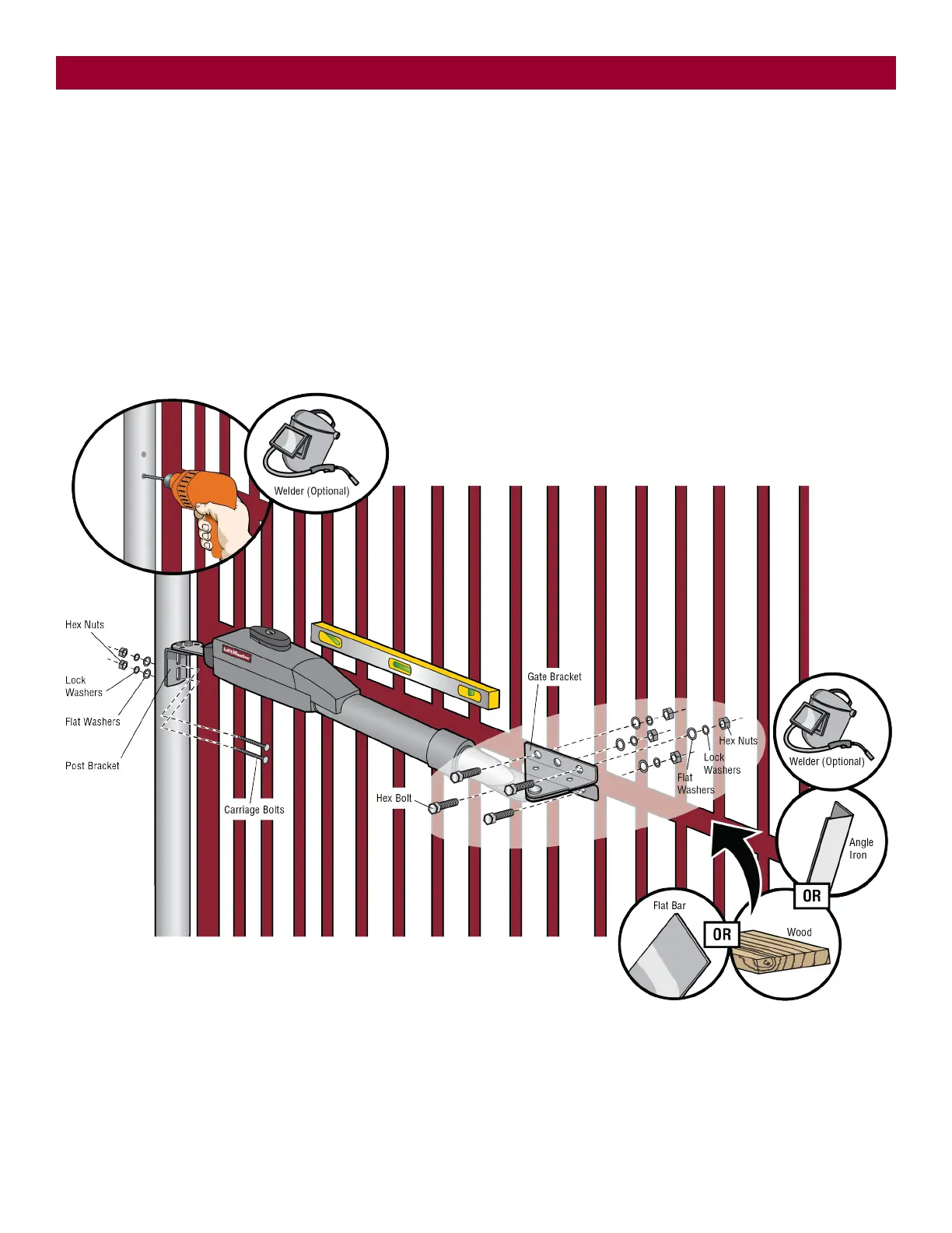 1. Drill holes in gate (or reinforcement, if necessary) that are large enough for the gate bracket mounting hardware.
