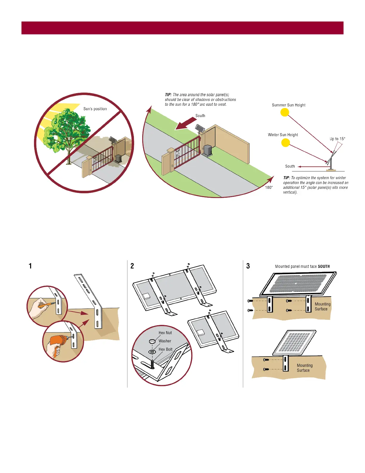 Solar panel(s) MUST be installed facing south. Use a compass to determine direction. Below are general instructions for installing the solar panel(s). Your