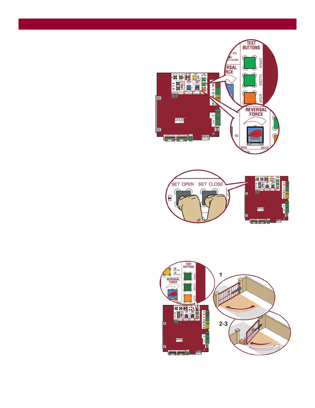 1. Open and close the gate with the TEST BUTTONS, ensuring that the