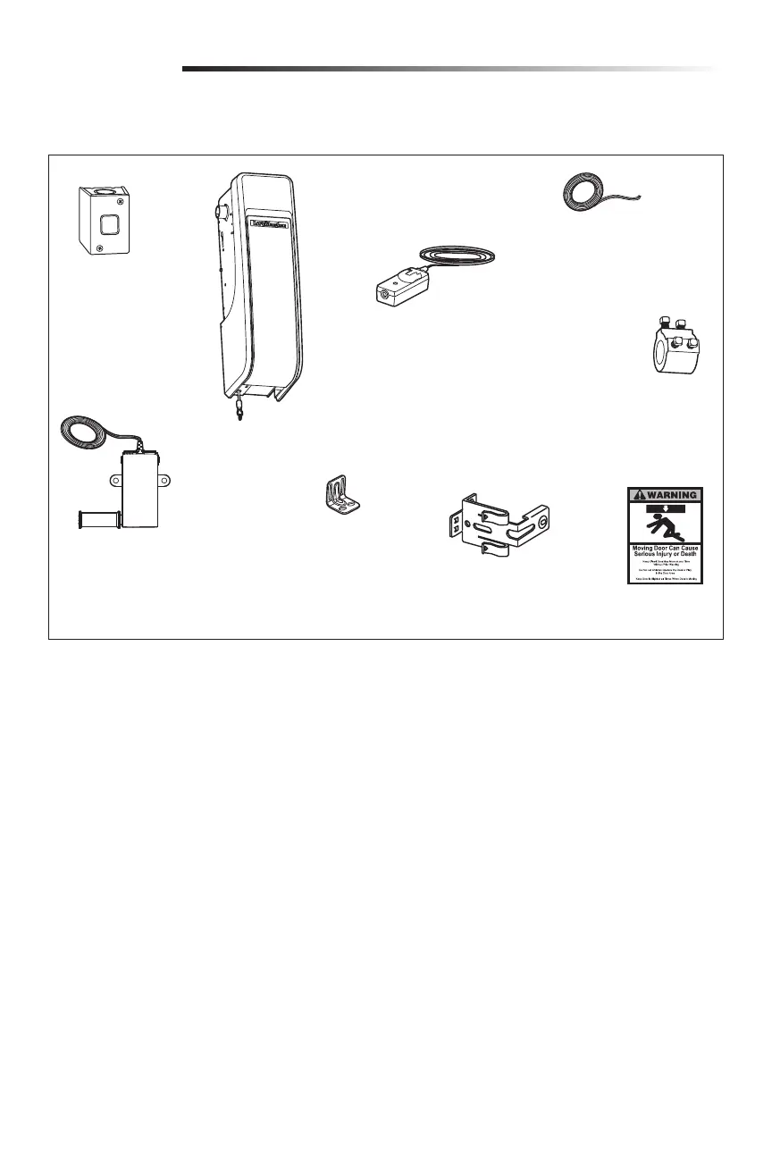 Votre opérateur de porte est emballé dans un carton qui contient l’unité moteur et les pièces illustrées ci-dessous. Si quelque chose