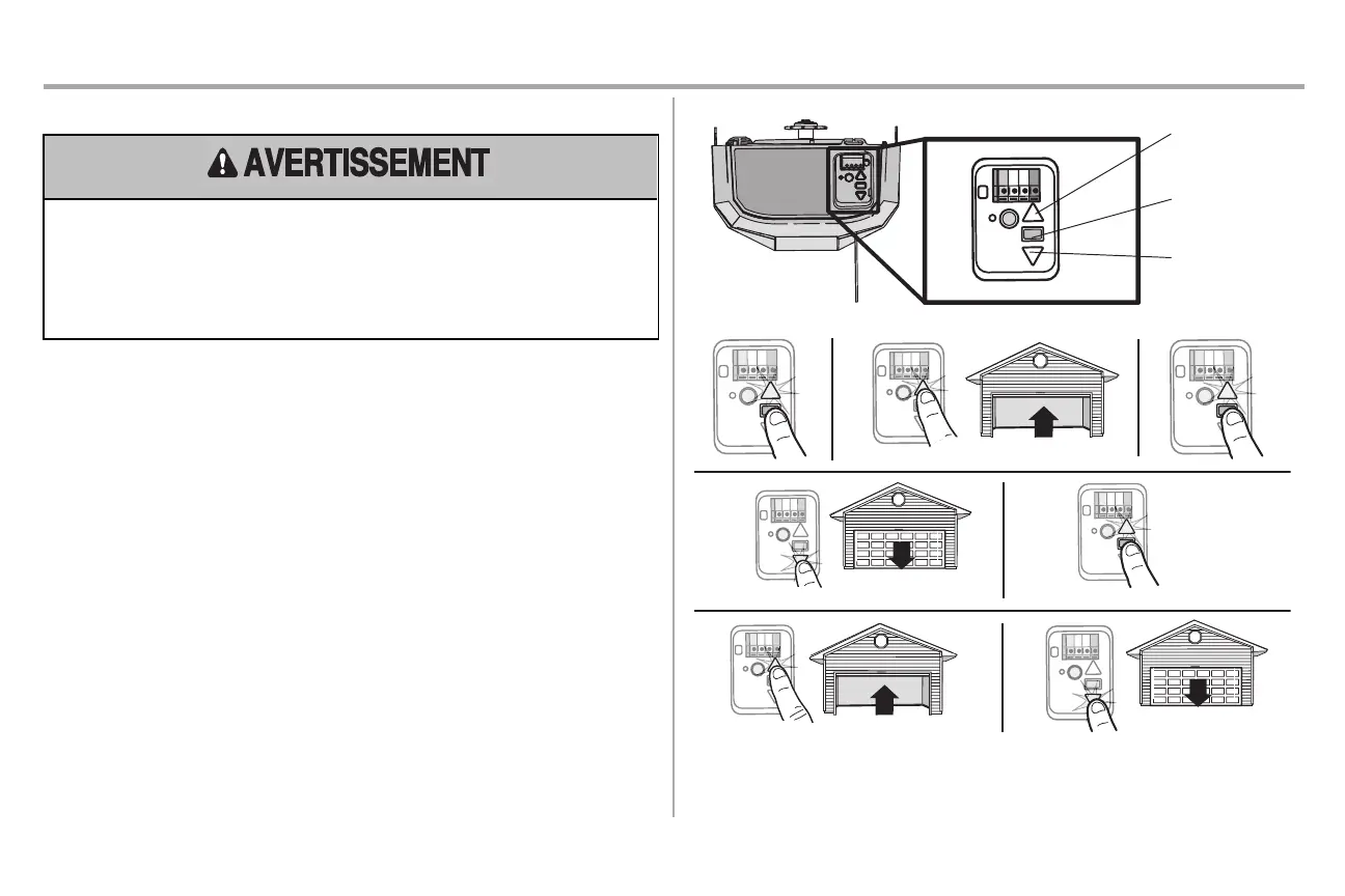 utilisant la télécommande ou les boutons UP et DOWN. La programmation est terminée. Si la porte ne s'actionne pas,