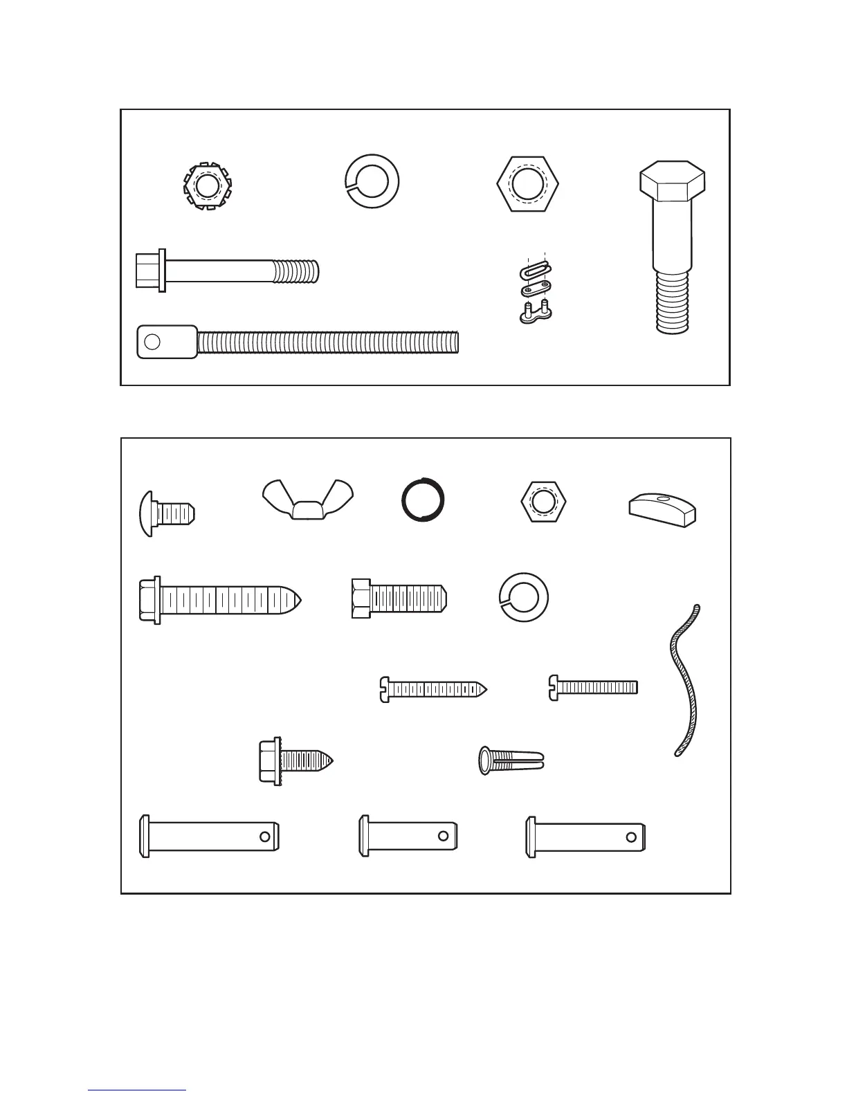 Separate all hardware and group as shown below for the assembly and installation procedures.