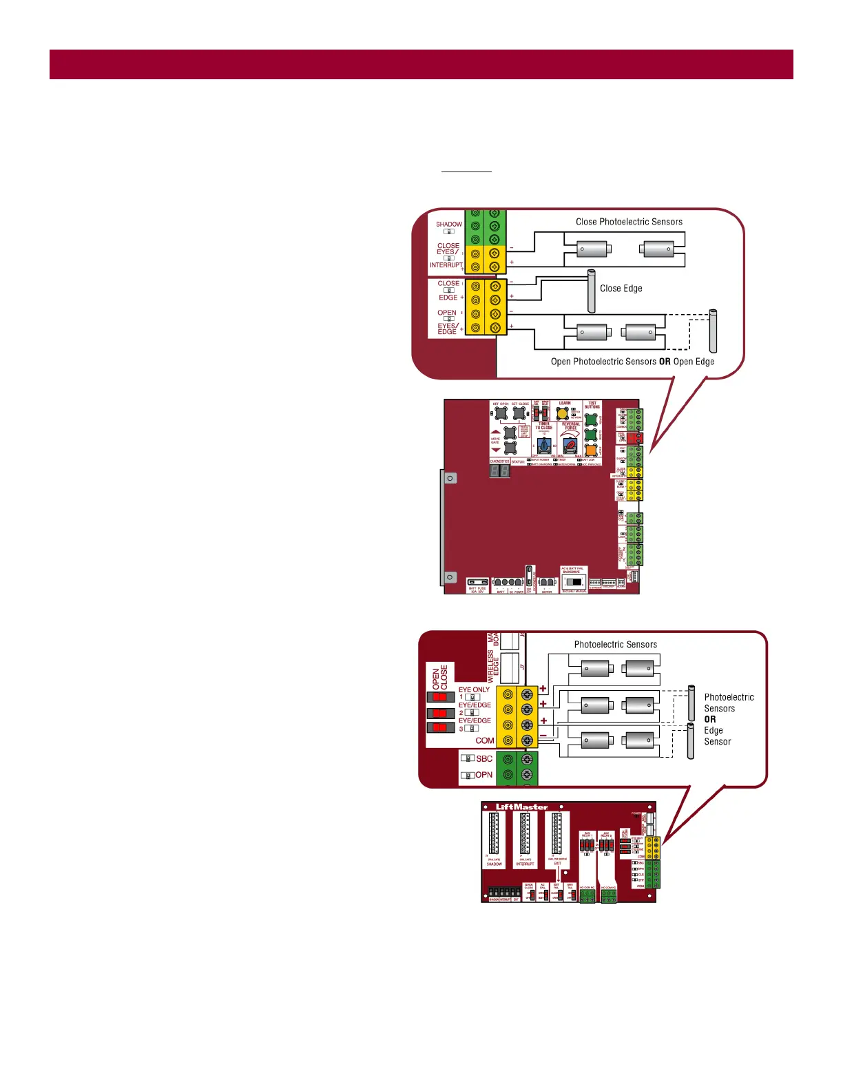 photoelectric sensors, resistive edge sensors, and pulsed edge sensors. Only one monitored entrapment protection device may be wired to each input.