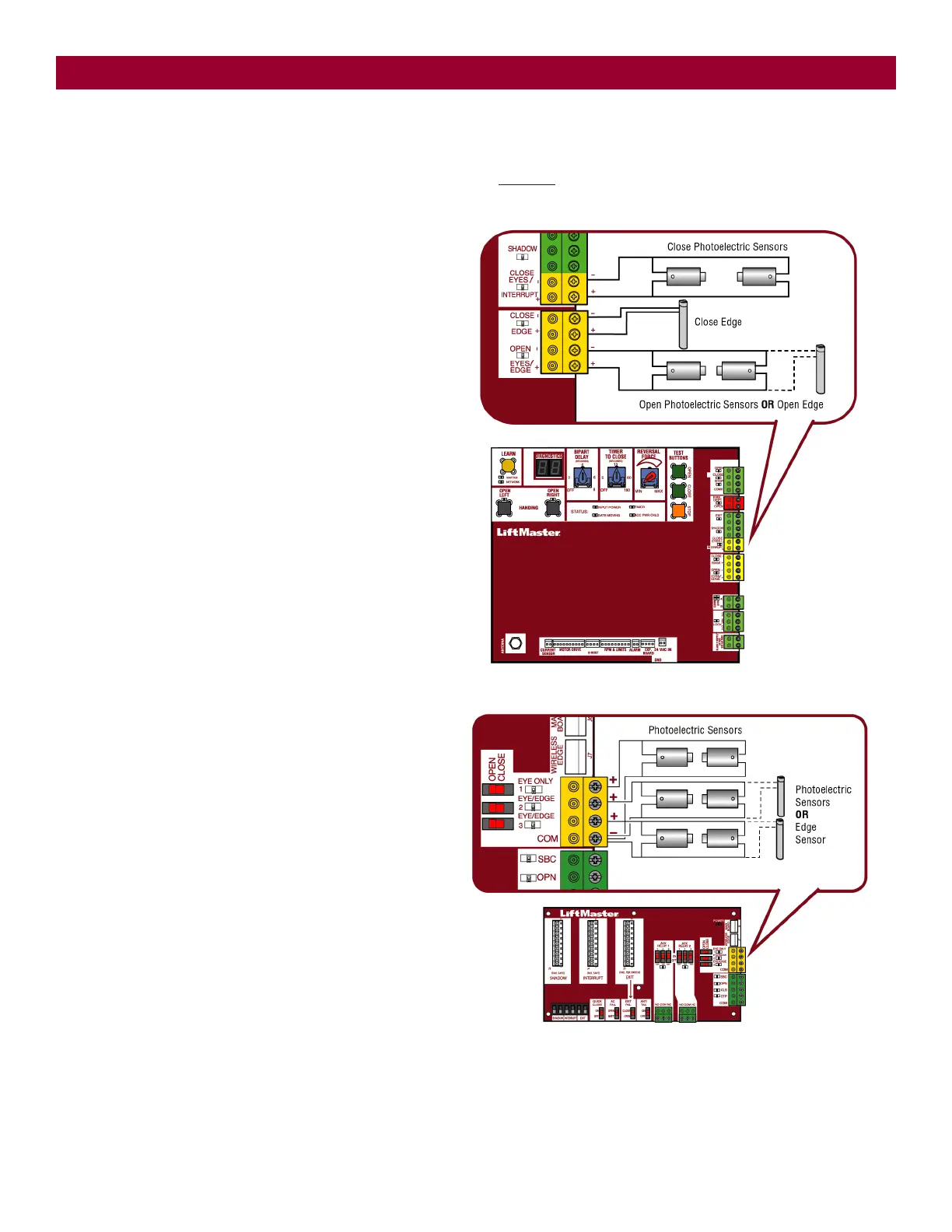 photoelectric sensors, resistive edge sensors, and pulsed edge sensors. Only one monitored entrapment protection device may be wired to each input.