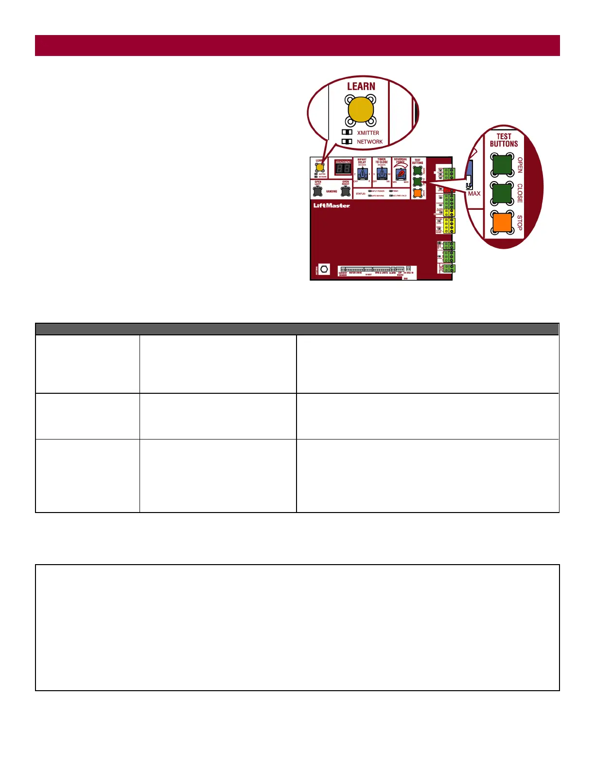 The operator will automatically exit learn mode (operator will beep and green XMITTER LED will go out) if programming is successful. To program