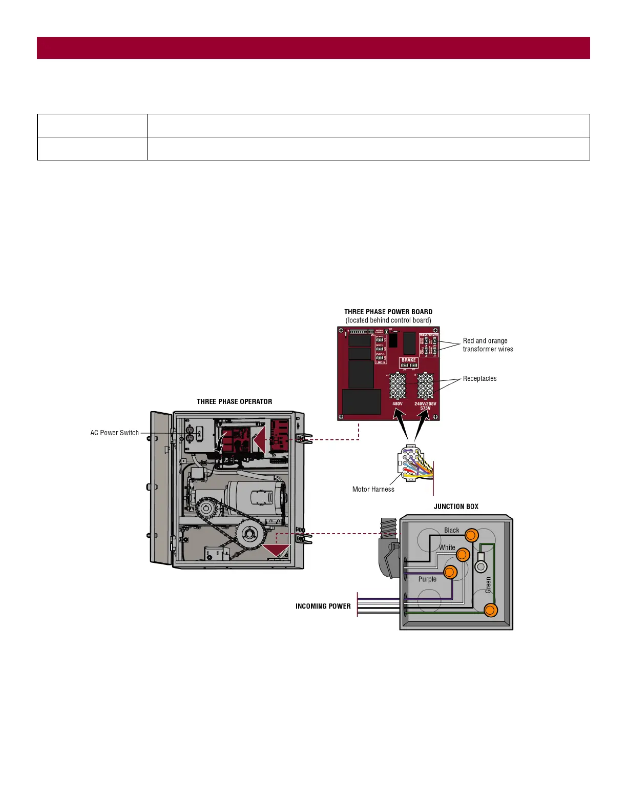 The operator is field configurable for usage at 208, 240, and 480 Vac. Factory default is 240 Vac. For three phase 575V operators, the operator is