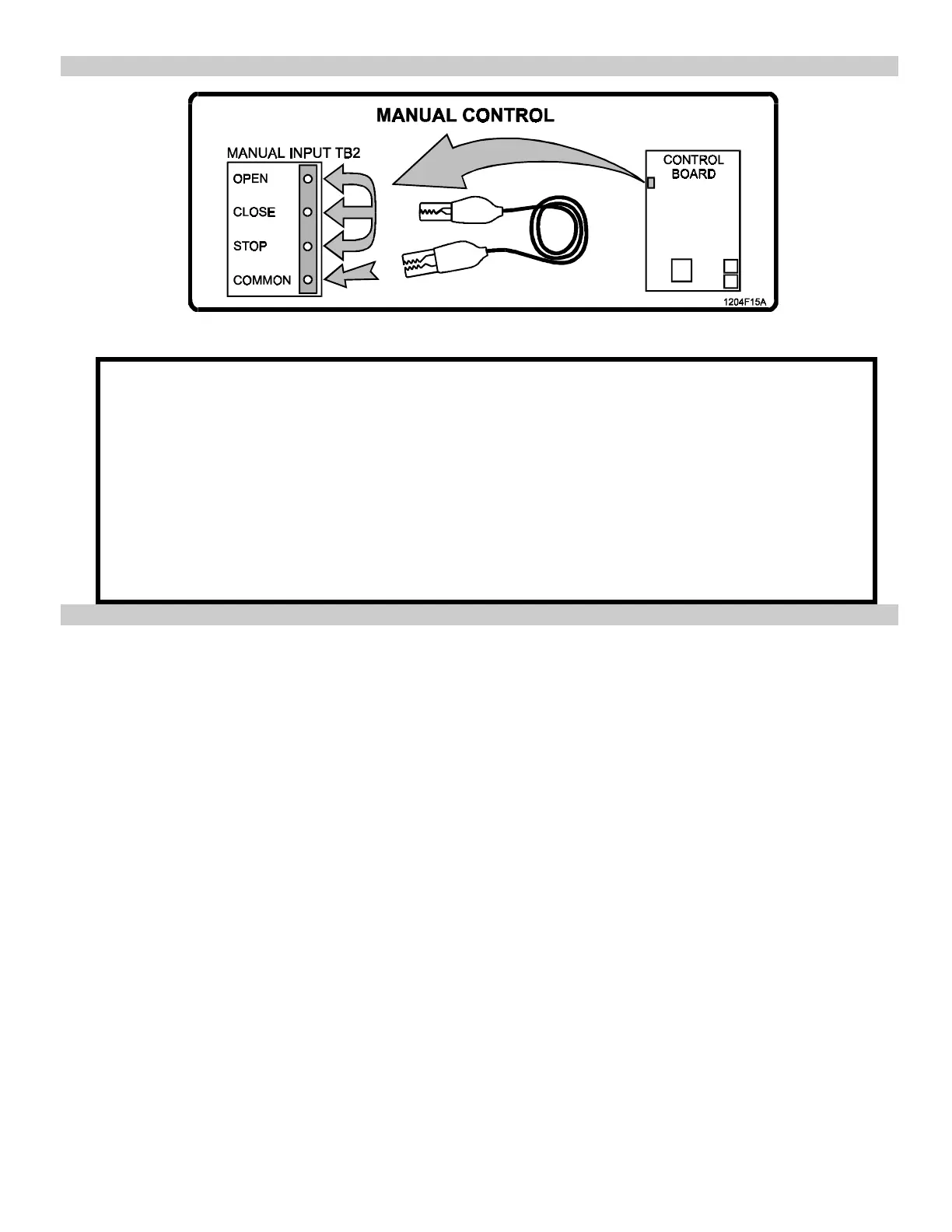 Use the manual controls on Manual Input Terminal TB2 (OPEN, CLOSE, and STOP, as shown in