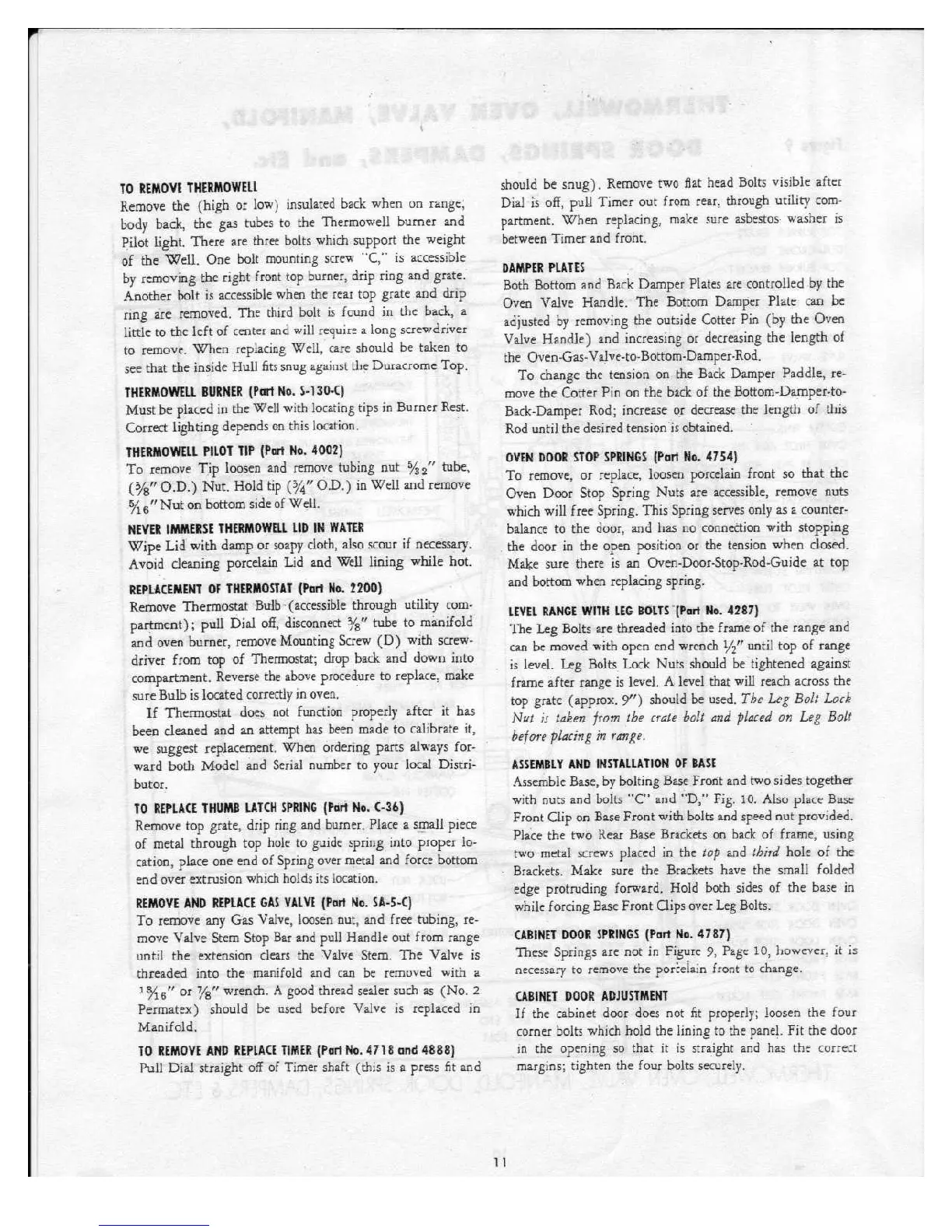 Chambers C series - Component Removal and Replacement; Thermowell and Burner Components Removal; Thermostat and Gas Valve Replacement; Range Leveling and Base Installation