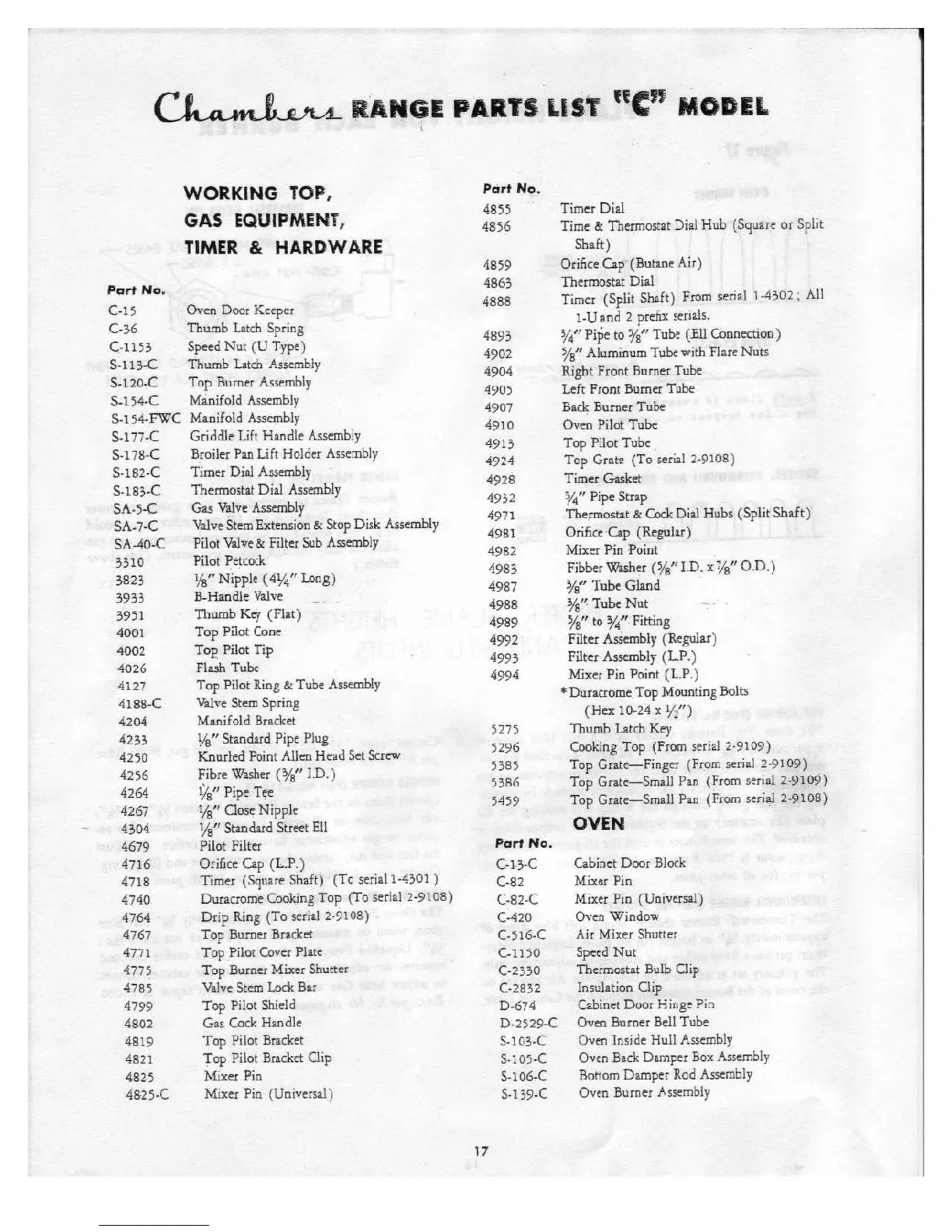 Chambers C series - Chambers Range Parts List C Model; Working Top, Gas Equipment, Timer & Hardware Parts; Oven and Related Parts
