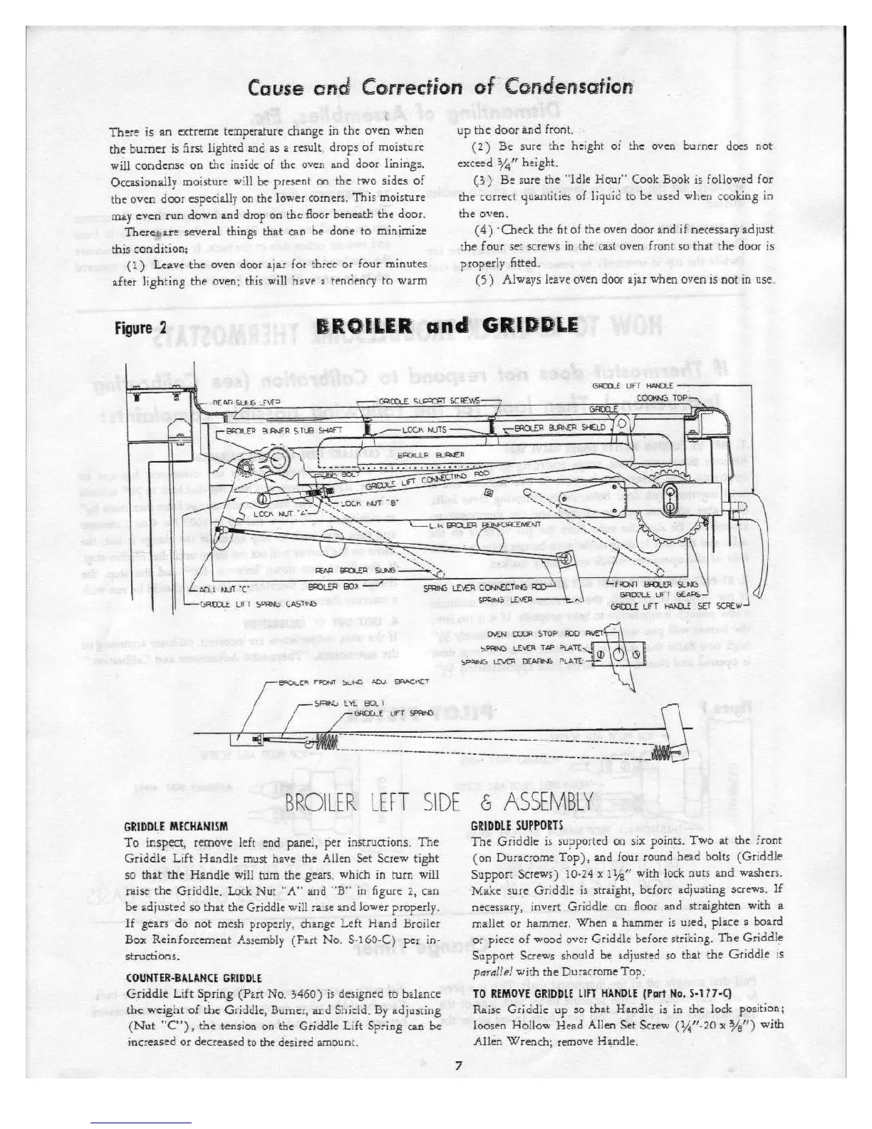 Chambers C series - Broiler and Griddle View; Cause and Correction of Condensation; Broiler Left Side and Assembly; To Remove Griddle Left Handle