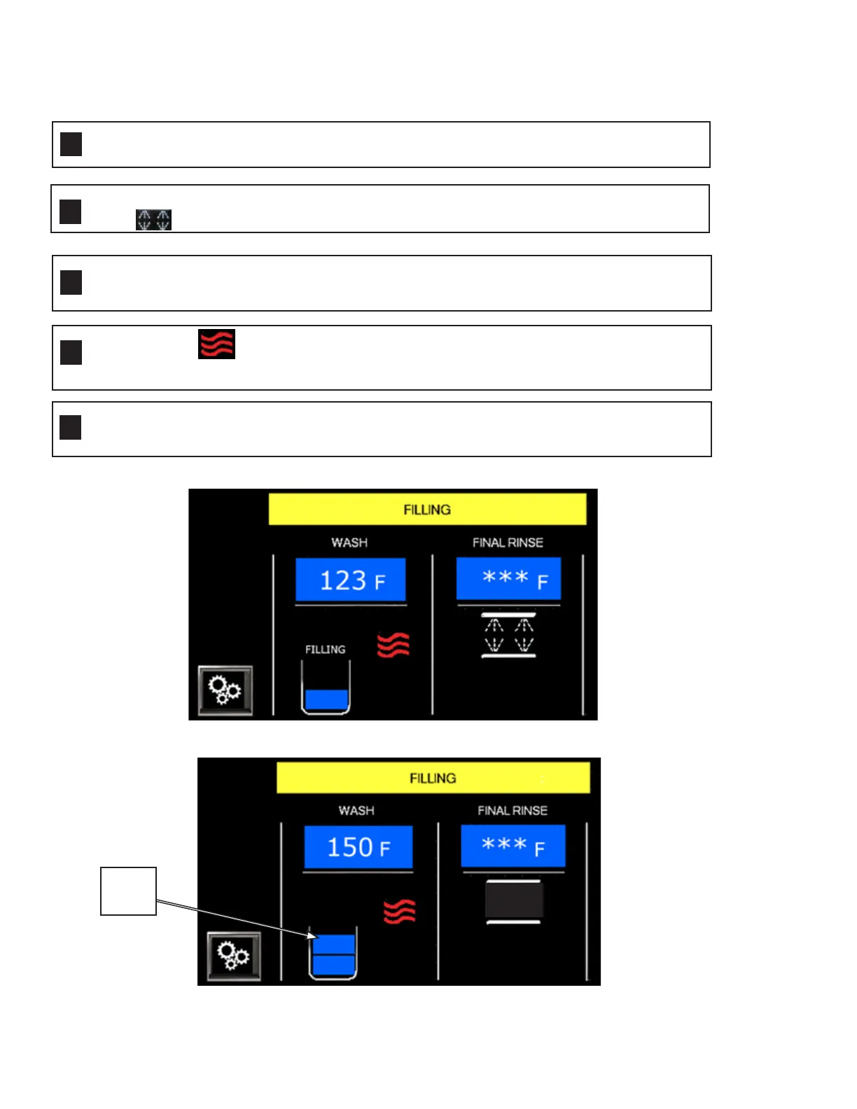 Rising water level in the wash tank is indicated by flashing blue blocks. The word, "Filling"