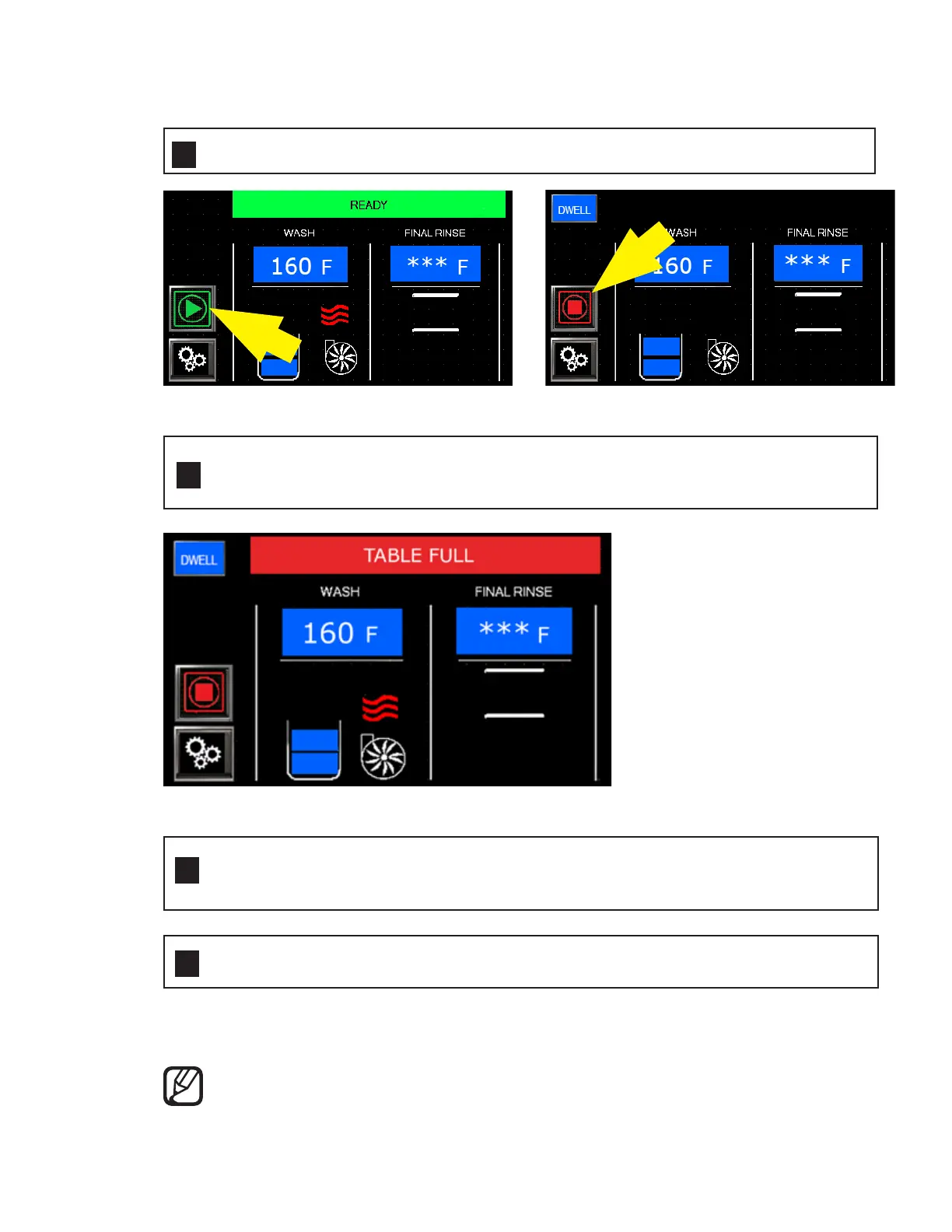 Load dish rack into machine. The status bar displays "TABLE FULL" as the rack is