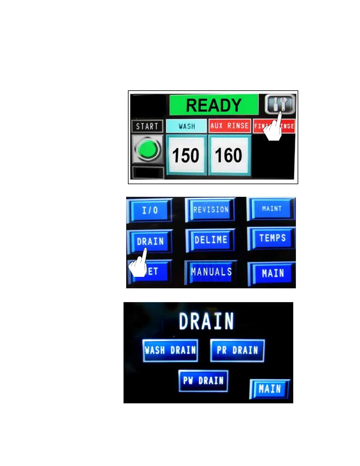 The electric drain valves can be opened using the "TOOLS" button and options screens.