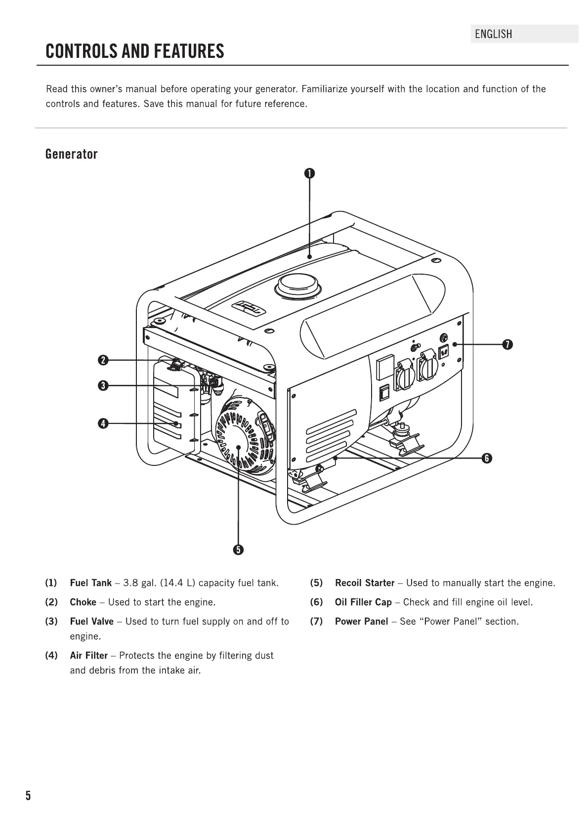 Champion CPG3500 - Controls and Features; Generator