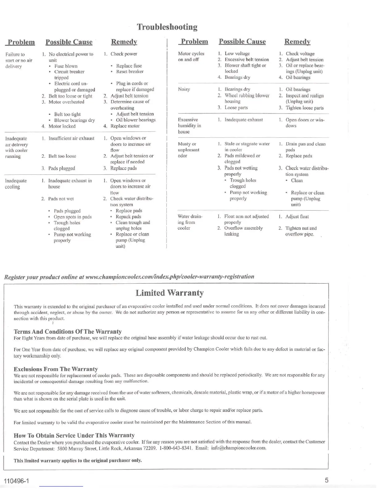 For limiled warranty to be valid the evaporative cooler must be maintained per the Maintenance Section of this manual.