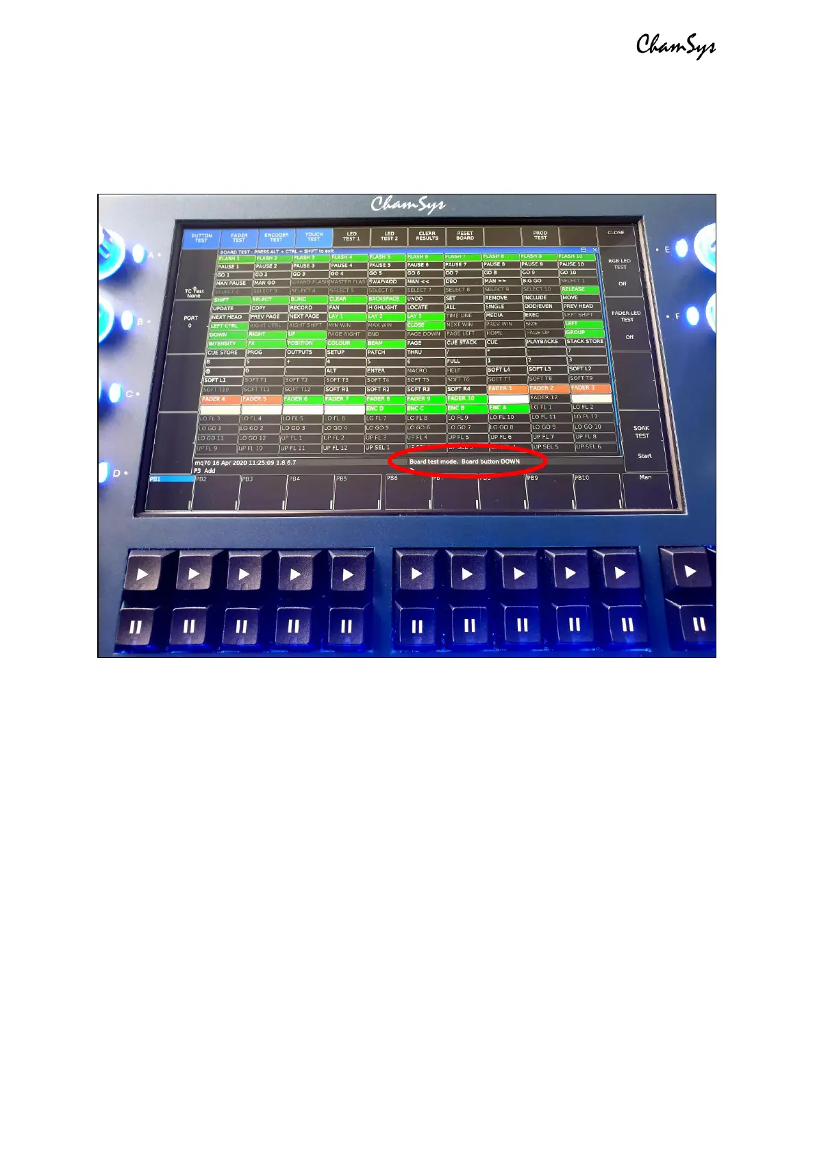 Once in board test mode you can begin testing the keys, faders and encoders on the