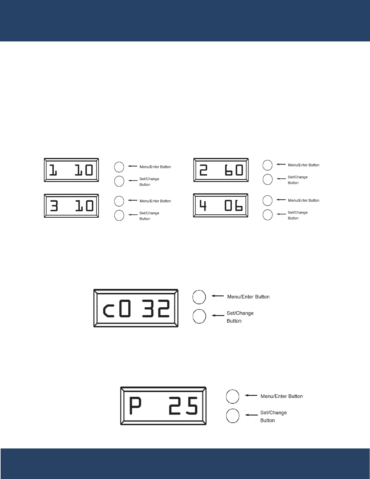 Press the Menu/Enter Button. The next 4 displays viewed are part of a series of ption settings used to