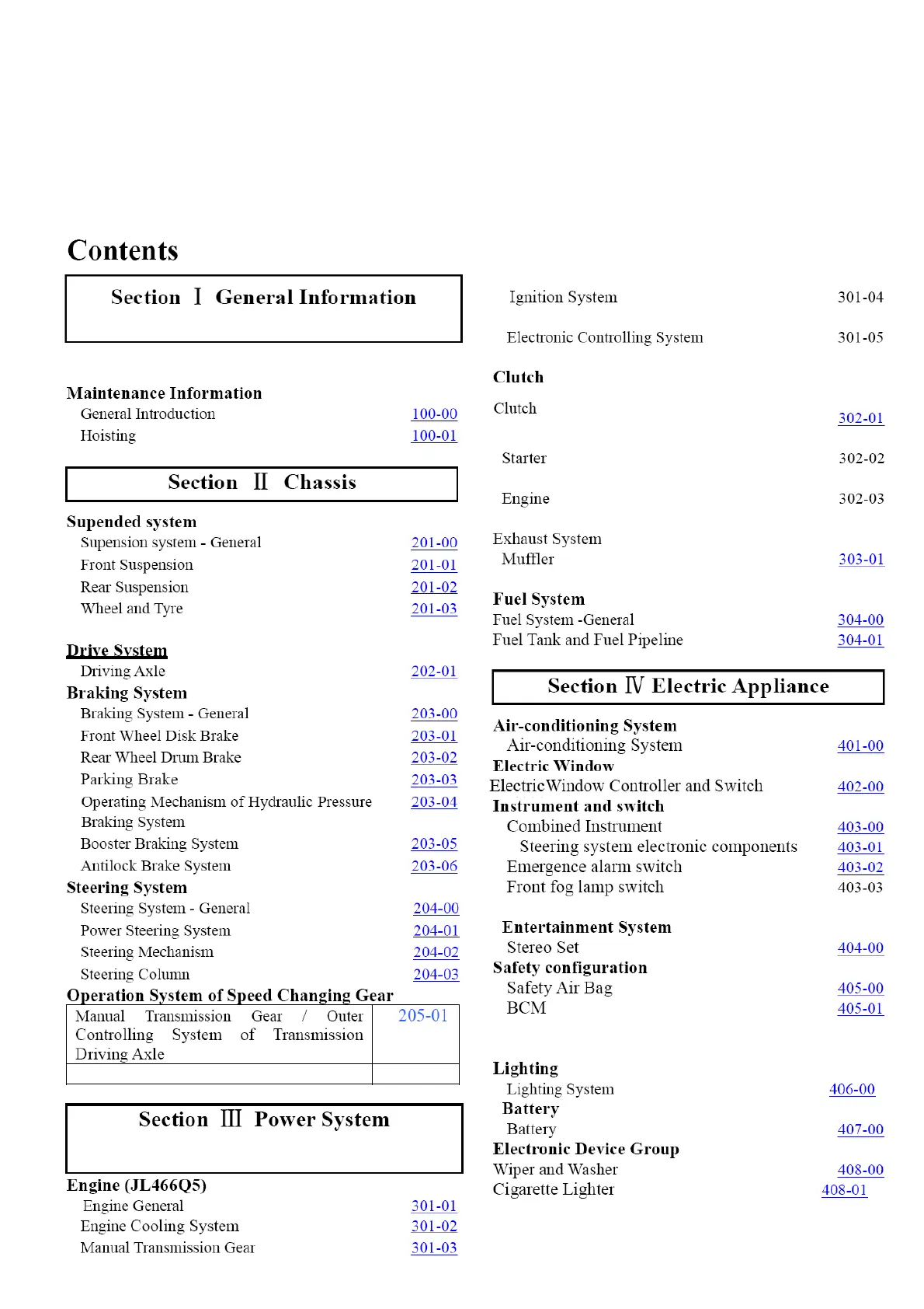 Changan BENNI MINI 2011 - Section I General Information; Section II Chassis; Drive System; Section III Power System
