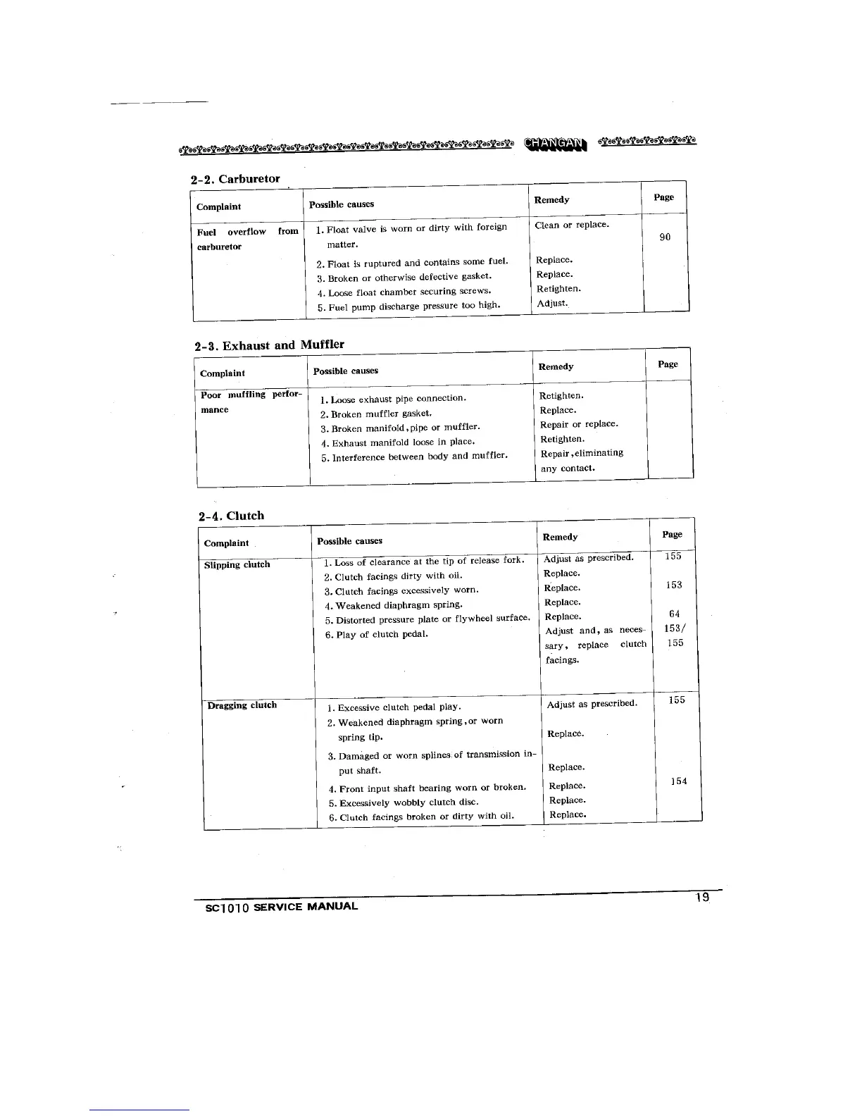 Changan SC1010 - Carburetor Troubleshooting; Exhaust and Muffler Troubleshooting; Clutch Troubleshooting