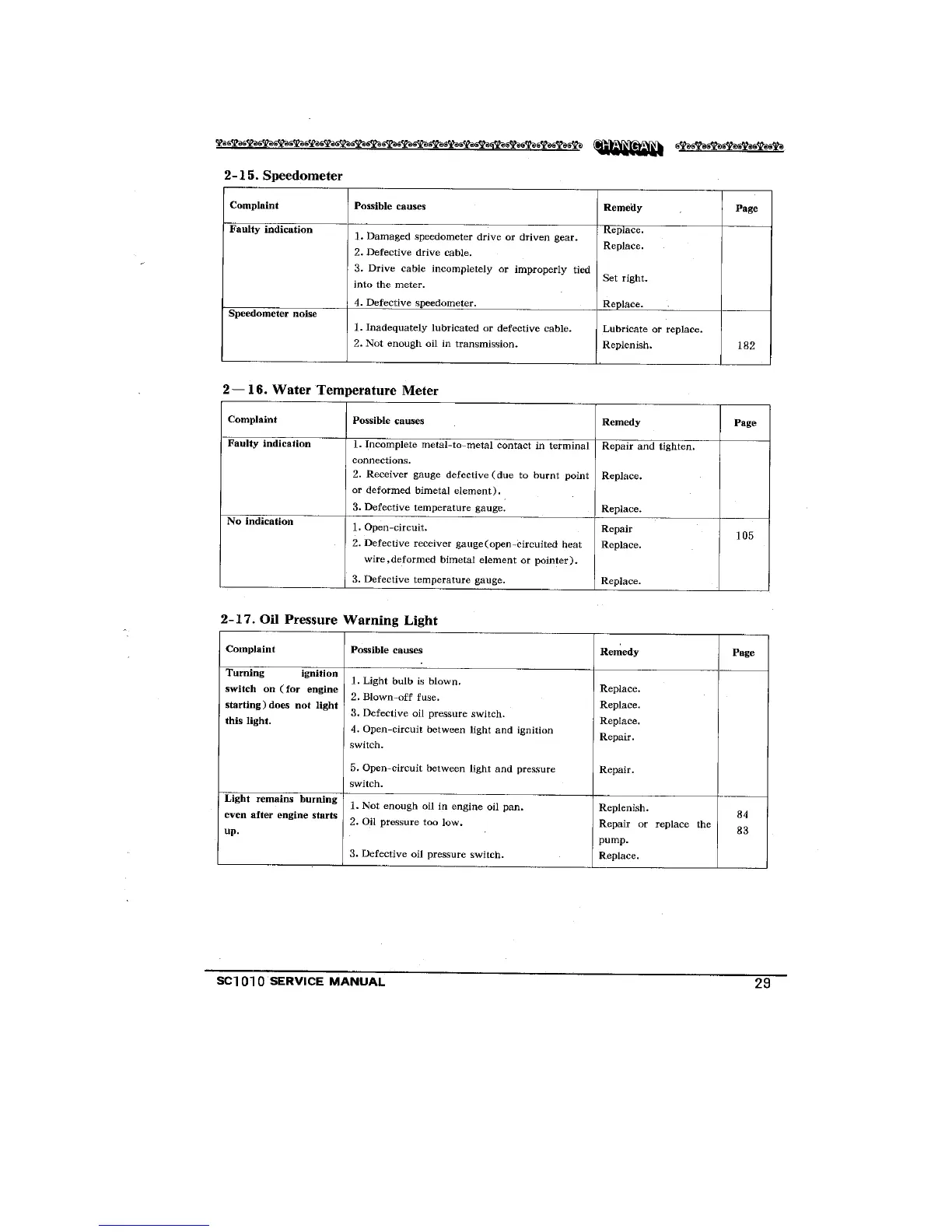 Changan SC1010 - Speedometer Troubleshooting; Water Temperature Meter Troubleshooting; Oil Pressure Warning Light Troubleshooting