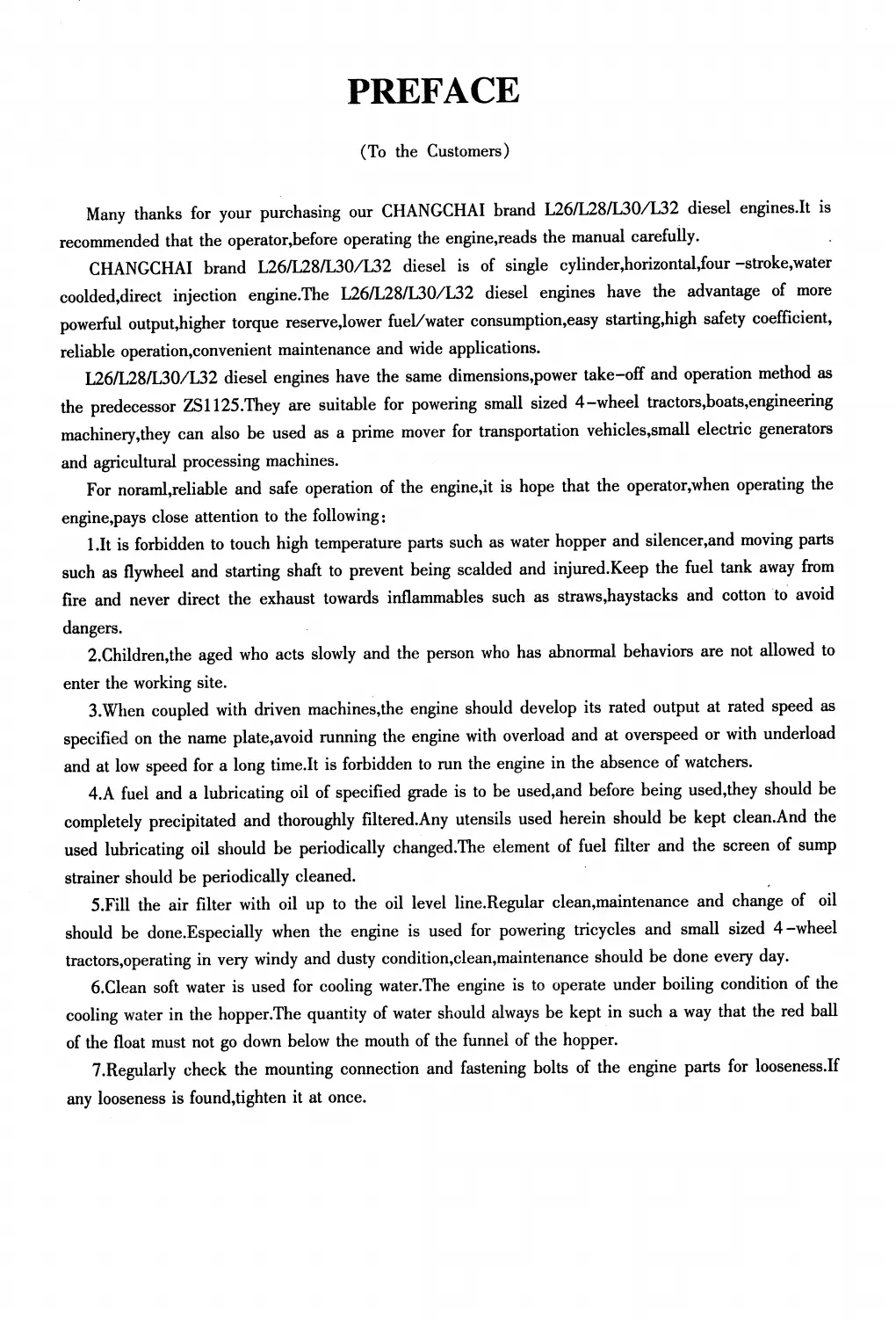 For noraml,reliable and safe operation of the engine,it is hope that the operator,when operating the