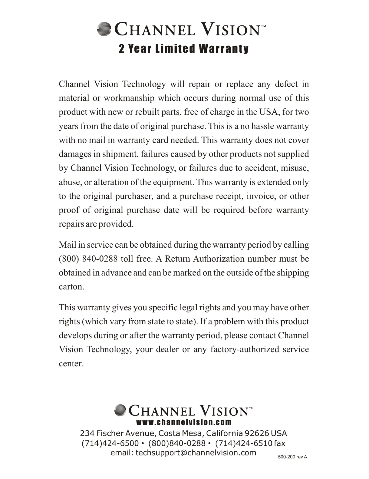 Channel Vision Technology will repair or replace any defect in