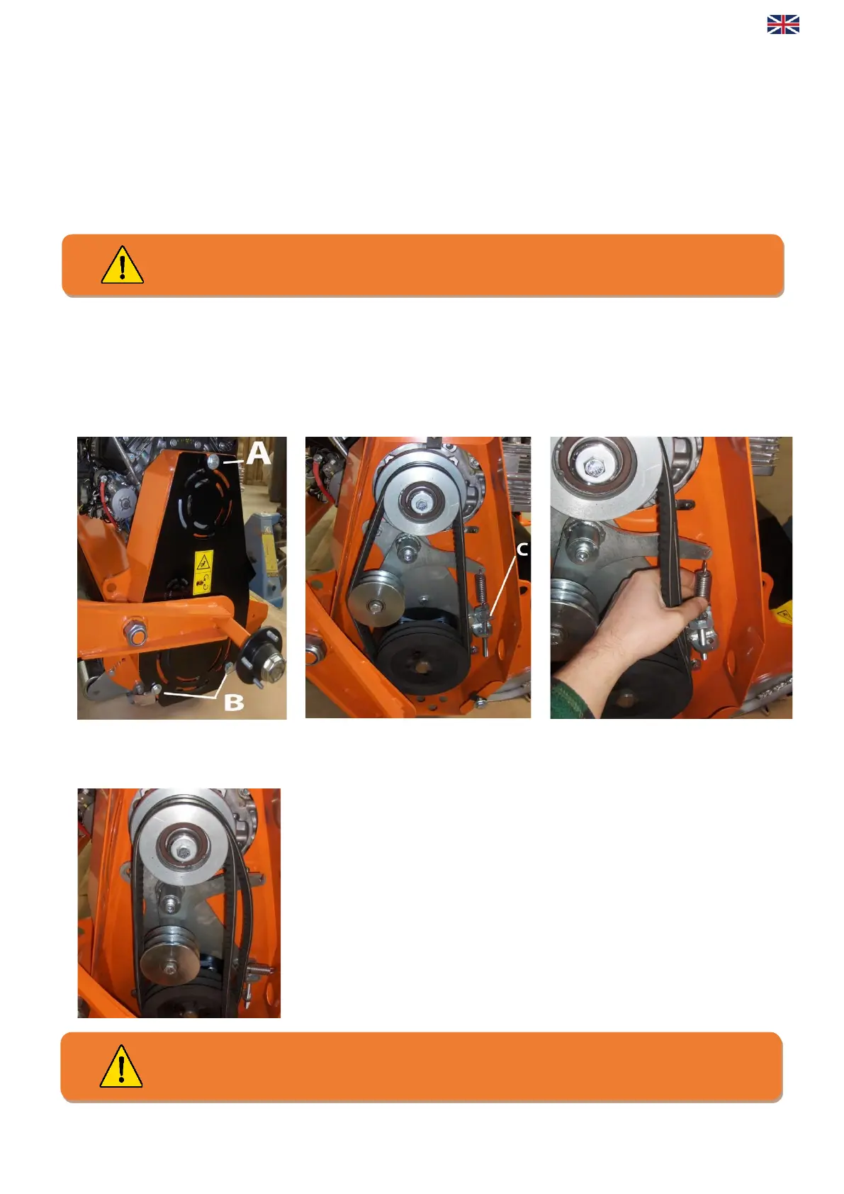 3. Slacken the tensioner adjuster bolt using two 17mm spanners, shown as part ‘C’ above. The tensioner adjuster should be slackened to