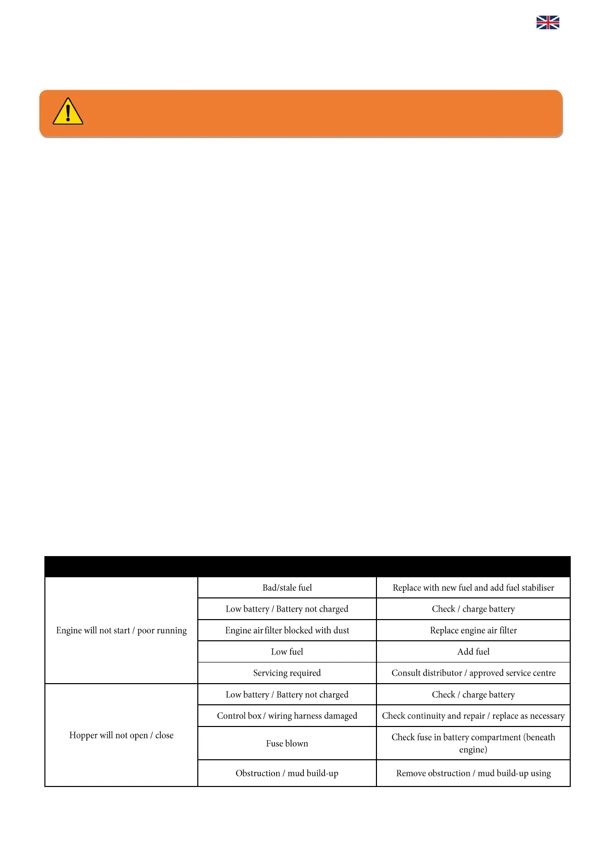 All maintenance, cleaning and repair operations must be performed with the machine suitably supported, the engine switched off (and cool), and