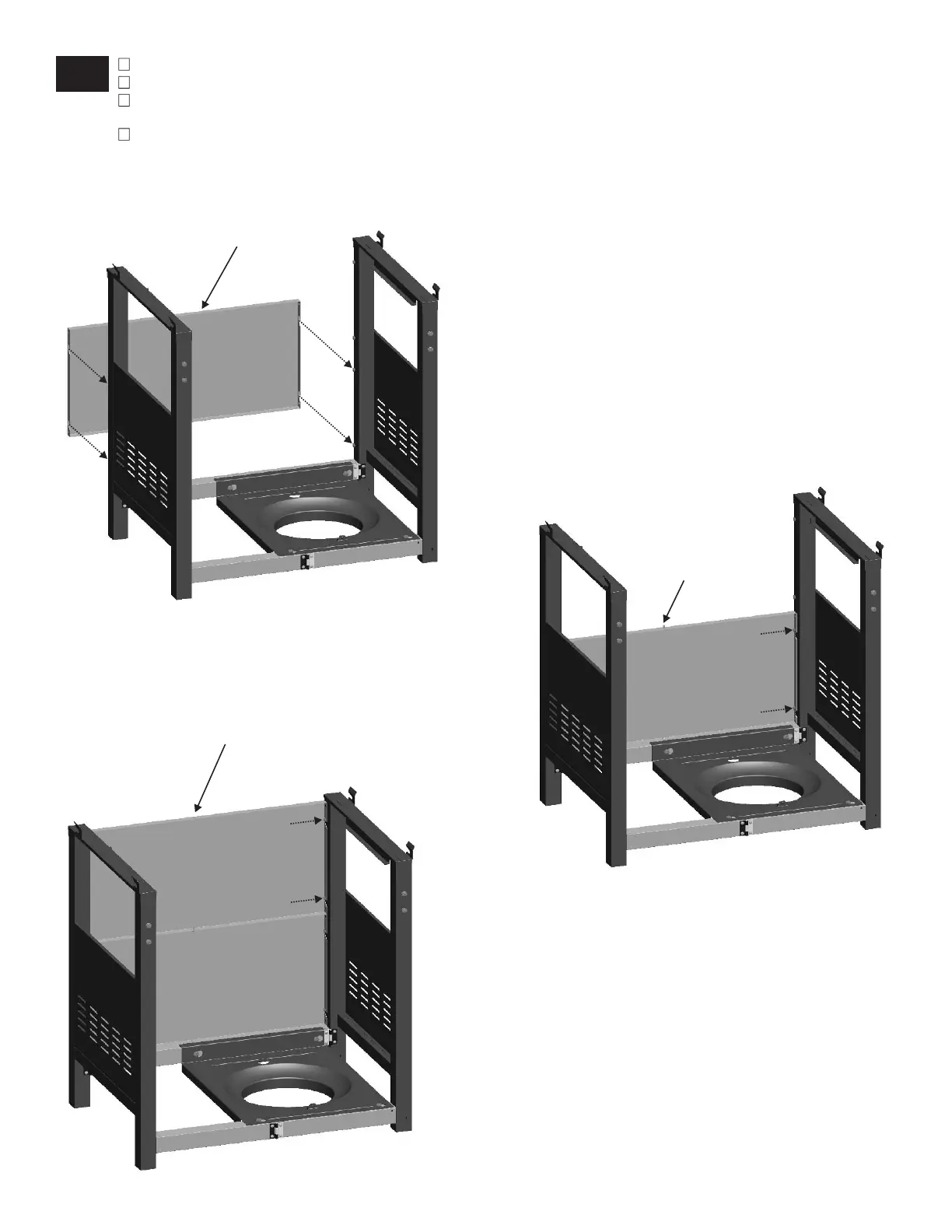 Place upper front panel(without pin) to cart like lower front panel. Make sure the hole on upper front panel is fit to the pin on lower