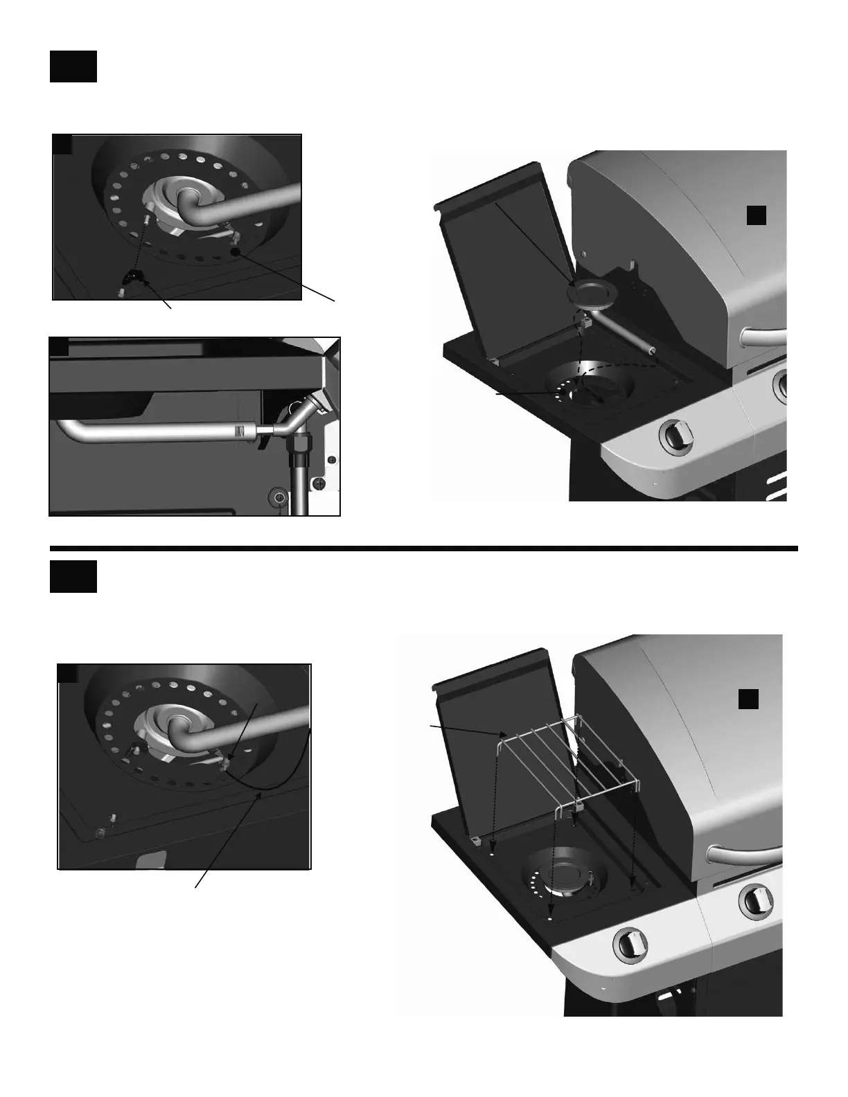 Under sideburner shelf, attach sideburner ignitor wire to electrode, shown A. Place sideburner grate onto sideburner shelf,