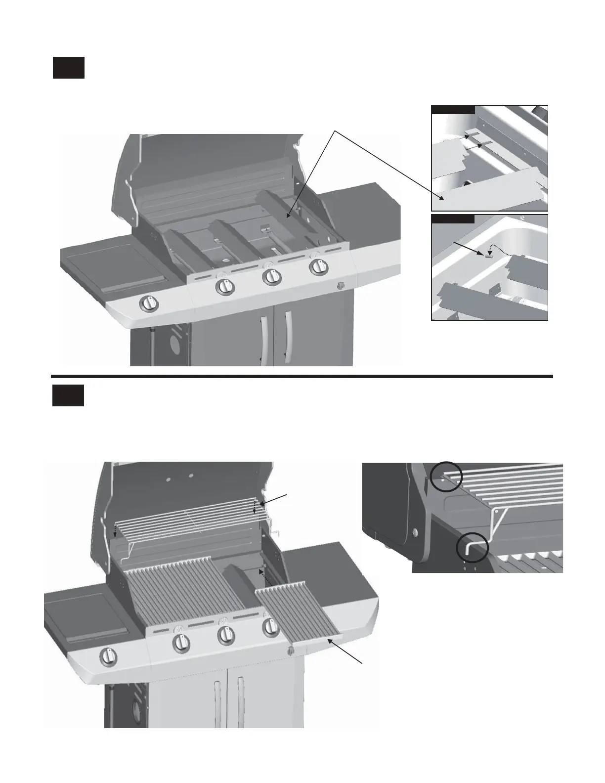 Place cooking grates onto the firebox as shown. Insert the two wire ends at rear of warming rack into holes in back of