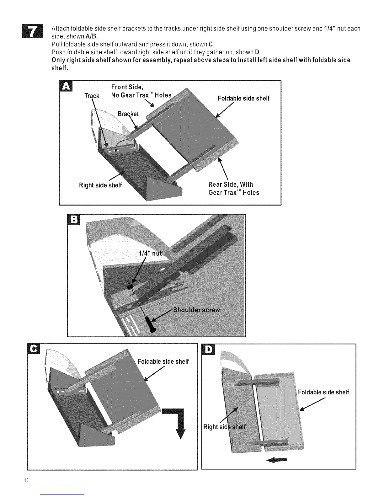 Attach foldable side shelf brackets to the tracks under right side shelf using one shoulder screw and 1/4" nut each