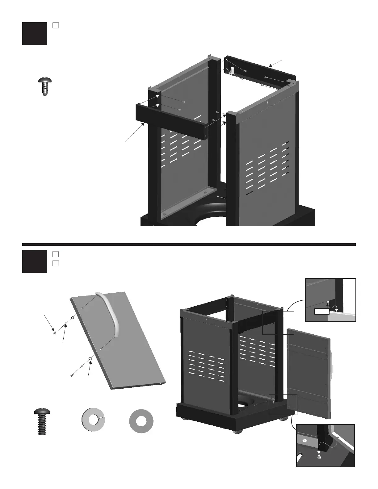 Attach upper door brace and back rail to cart side frames with #8x3/8” sheet metal screws.