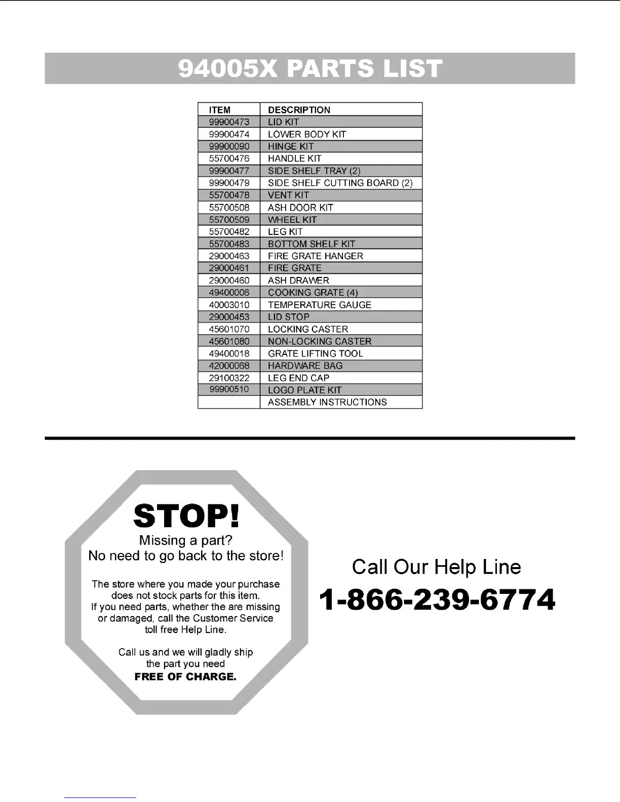 Char-Broil 940X - Parts and Hardware Identification; 94005 X Parts List