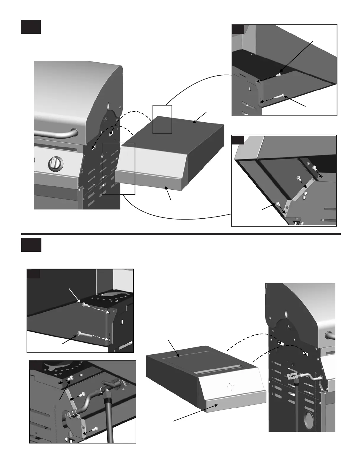 Insert tabs on left sideburner shelf assembly into rectangular slots in side of firebox. Attach rear of shelf using one 1/4-