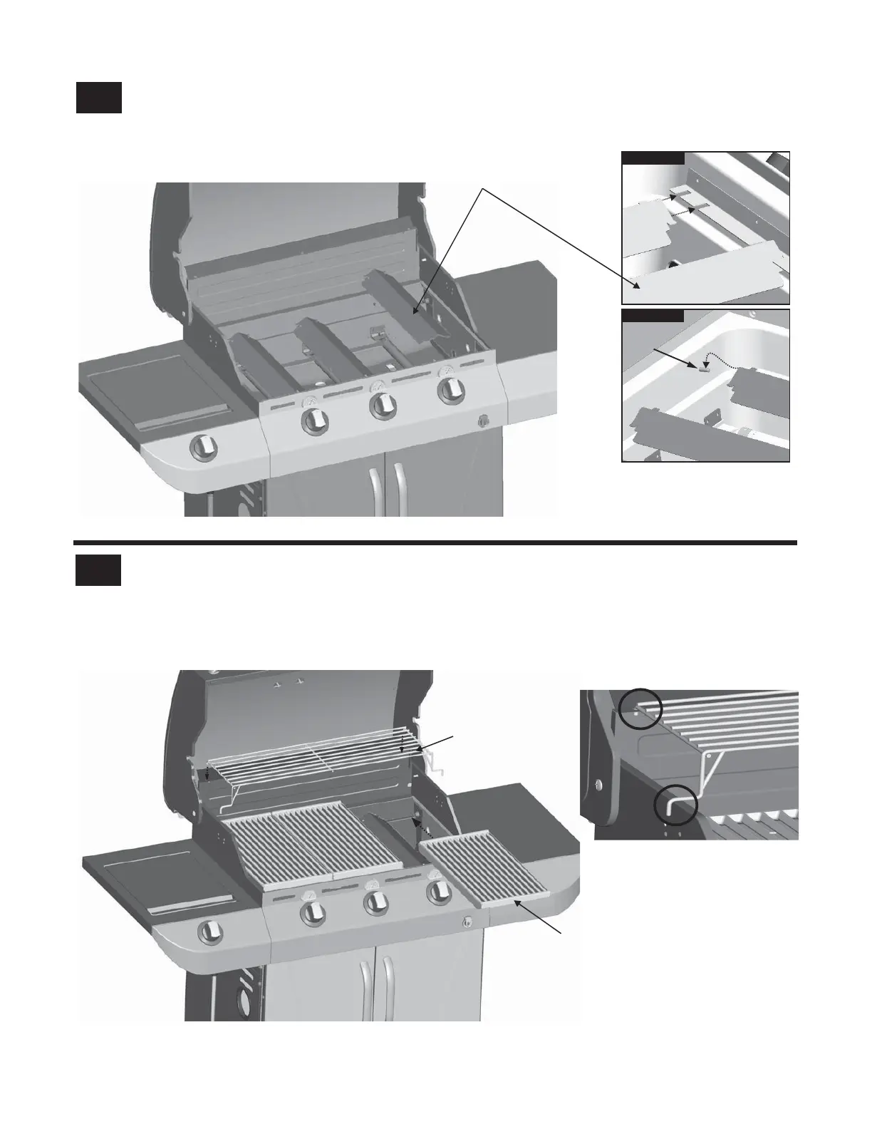 Place cooking grates onto the firebox as shown. Insert the two wire ends at rear of warming rack into holes in back of